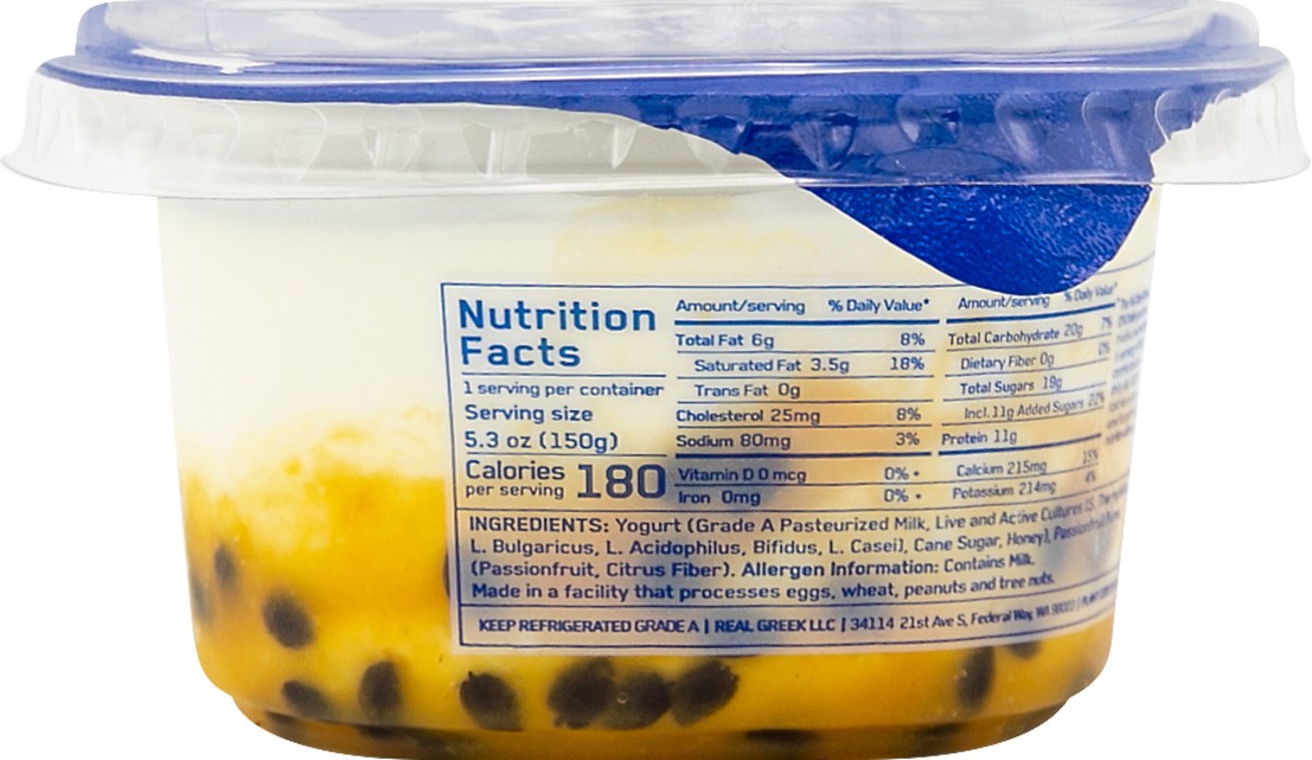 Yogurt (Grade A Pasteurized Milk, Live and Active Cultures [S. Thermophilus, L. Bulgaricus, L. Acidophilus, Bifidus, L. Casei], Cane Sugar, Honey), Passionfruit, Puree, (Passionfruit, Citrus Fiber).