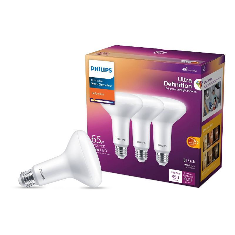 Philips UltraDef LED 65W Soft White BR30 3P: Dimmable Energy Star Certified Light Bulbs, 650 Lumens, E26 Base, 2700K
