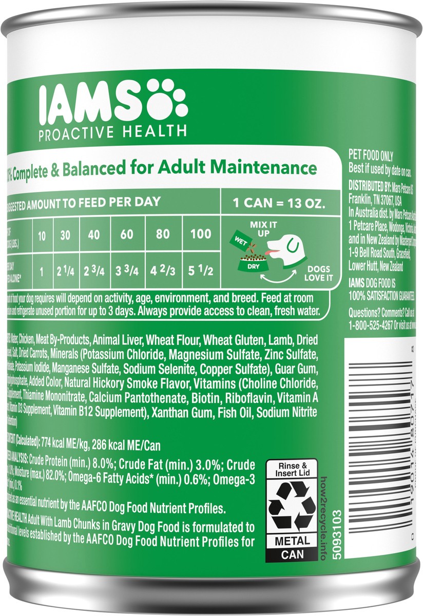 Calorie Content (Calculated): 774 kcal ME/kg, 286 kcal ME/can. IAMS Proactive Health Adult Chunks in Gravy Dog Food is formulated to meet the nutritional levels established by the AAFCO Dog Food Nutri…