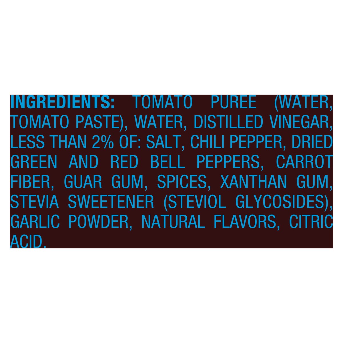Tomato Puree (Water, Tomato Paste), Water, Distilled Vinegar, Less than 2% of: Salt, Chili Pepper, Dried Green and Red Bell Peppers, Carrot Fiber, Guar Gum, Spices, Xanthan Gum, Stevia Sweetener (Stev…