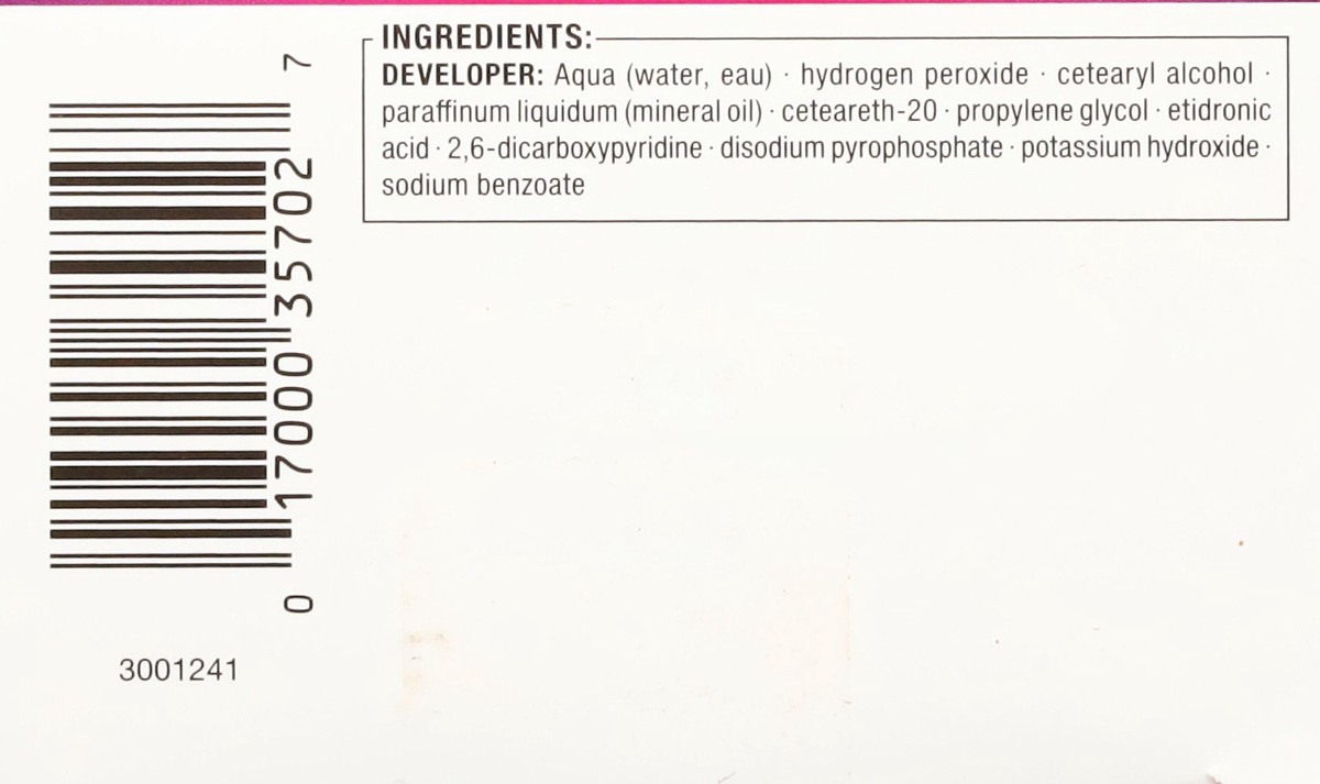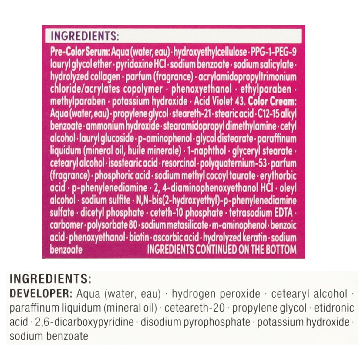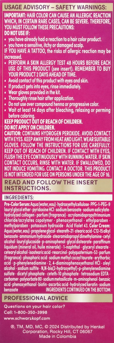 Pre-Color Serum: Aqua (water, eau), hydroxyethylcellulose, PPG-1-PEG-9 lauryl glycol ether, pyridoxine HCl, sodium benzoate, sodium salicylate, hydrolyzed collagen, parfum (fragrance), acrylamidopropy…