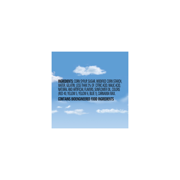Corn Syrup, Sugar, Modified Corn Starch, Water, Gelatin; Less than 2% of: Citric Acid, Malic Acid, Natural and Artificial Flavors, Sunflower Oil, Colors (Red 40, Yellow 5, Yellow 6, Blue 1), Carnauba …
