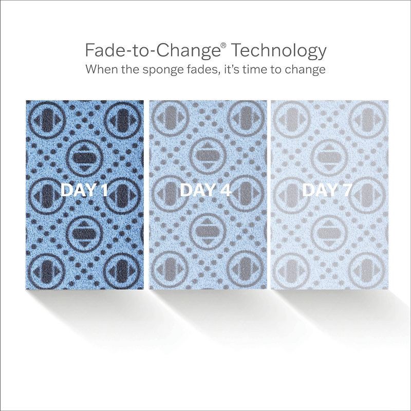 - TELL YOU WHEN TO TOSS Leading microbiologists recommend changing your sponge every 1-2 weeks. The monogram on the scouring side tells you when to toss. We call it Fade-to-Change technology.