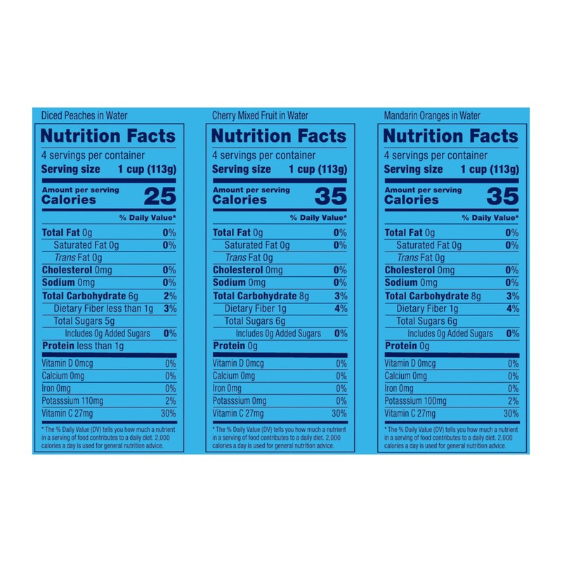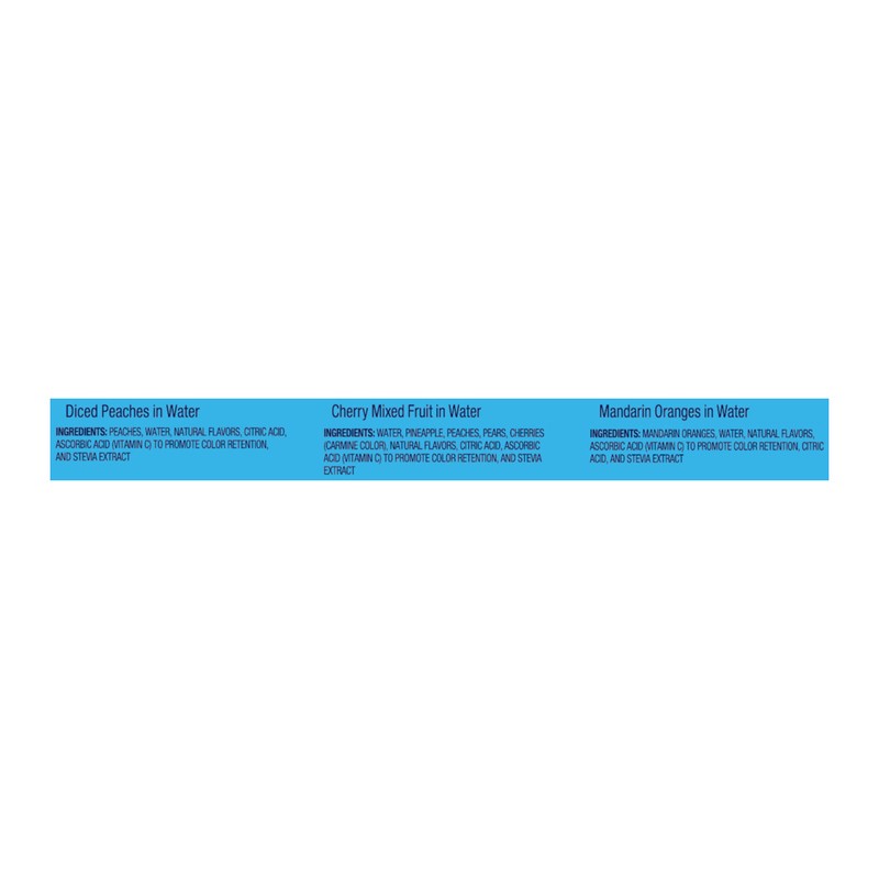 Diced Peaches Ingredients: Peaches, Water, Natural Flavors, Citric Acid, Ascorbic Acid (Vitamin C) to Promote Color Retention, and Stevia Extract. Cherry Mixed Fruit Ingredients: Water, Pineapple, Pea…