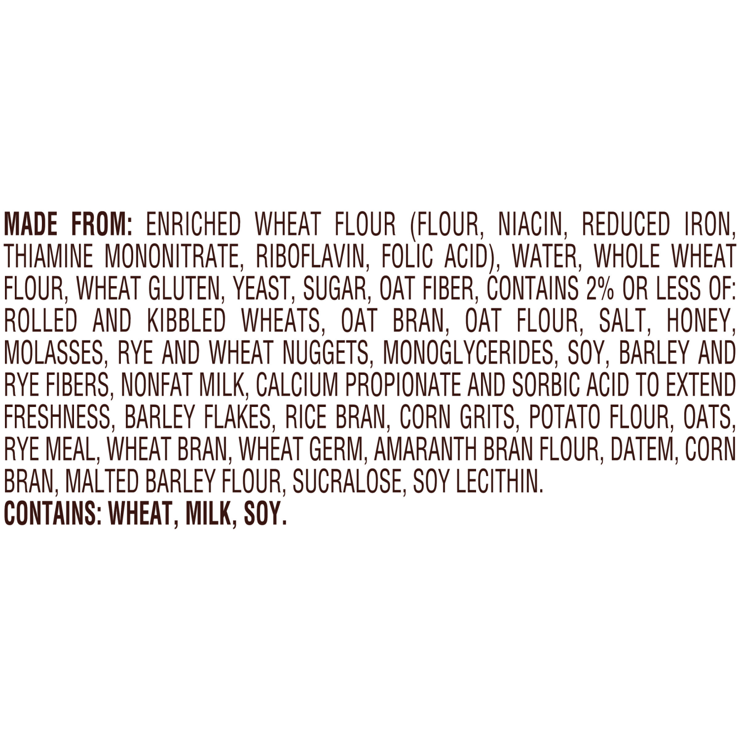 MADE FROM: ENRICHED WHEAT FLOUR (FLOUR, NIACIN, REDUCED IRON, THIAMINE MONONITRATE, RIBOFLAVIN, FOLIC ACID), WATER, WHOLE WHEAT FLOUR, WHEAT GLUTEN, YEAST, SUGAR, OAT FIBER, CONTAINS 2% OR LESS OF: RO…