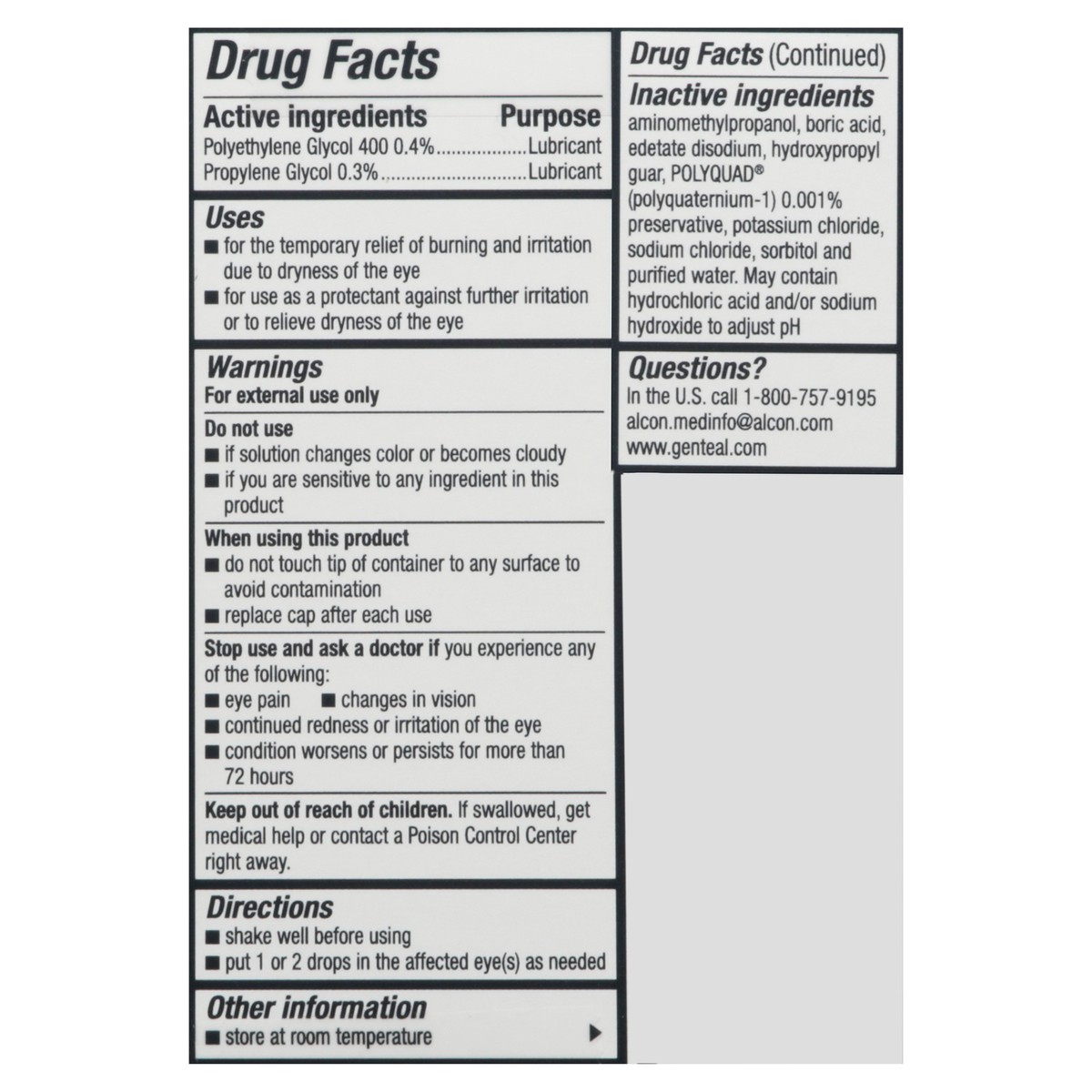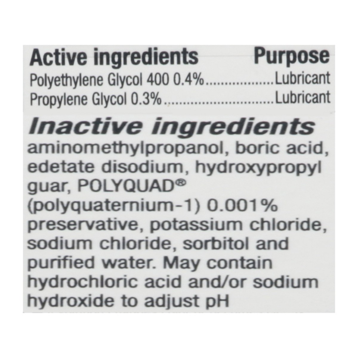 Active Ingredients: Polyethylene Glycol 400 (0.4 %), Lubricant; Propylene Glycol (0.3 %), Lubricant. Inactive Ingredients: Aminomethylpropanol, Boric Acid, Edetate Disodium, Hydroxypropyl Guar, Polyqu…