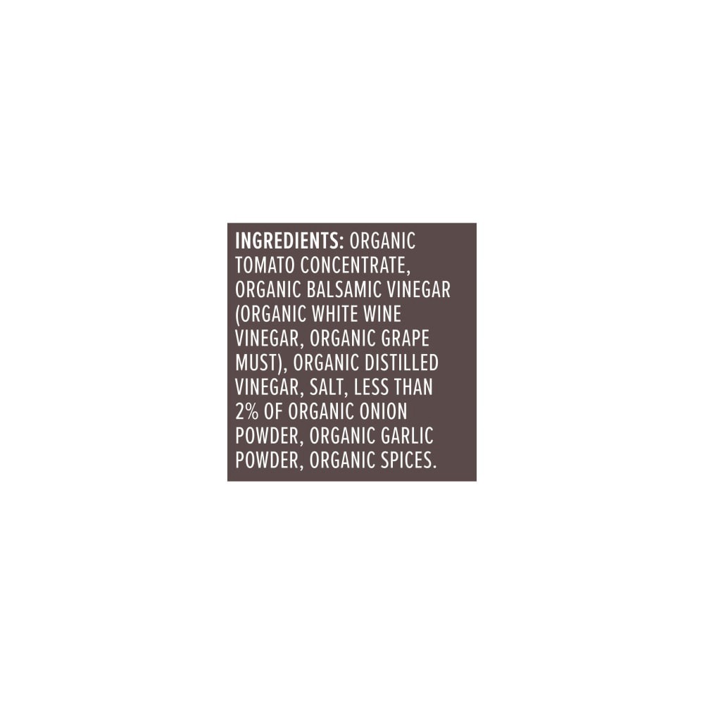 Organic Tomato Concentrate, Organic Balsamic Vinegar (Organic White Wine Vinegar, Organic Grape Must), Organic Distilled Vinegar, Salt, Less than 2% of Organic Onion Powder, Organic Garlic Powder, Org…