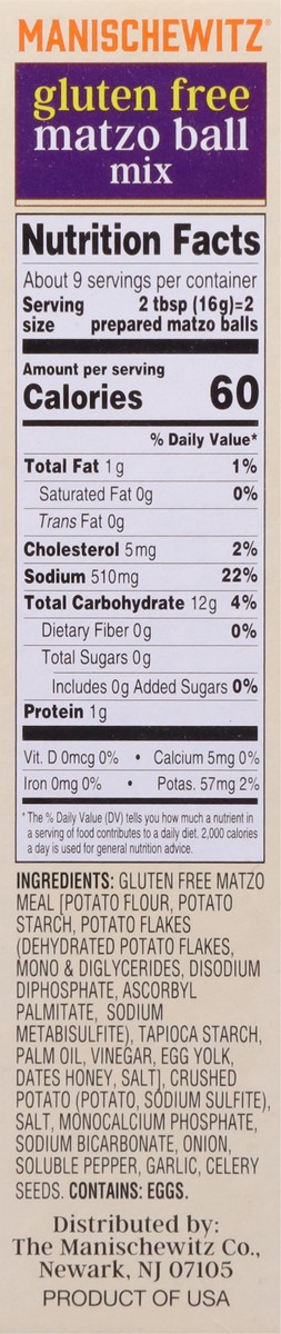 Gluten Free Matzo Meal [Potato Flour, Potato Starch, Potato Flakes (Dehydrated Potato Flakes, Mono & Diglycerides, Disodium Diphosphate, Ascorbyl Palmitate, Sodium Metabisulfite), Tapioca Starch, Palm…