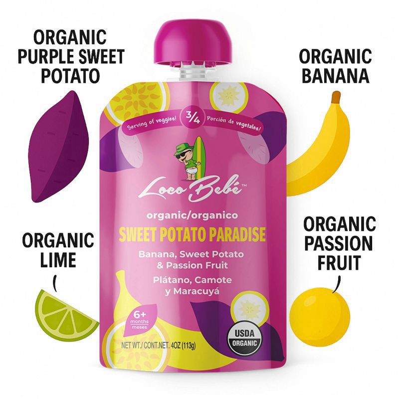What do you get when you nutrient dense organic Purple Sweet potatoes, Banana and Passion Fruit? Loco Bebé's delicious and nutritious way to experience the bold flavor of the Caribbean. We grow our Pu…