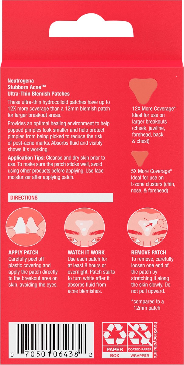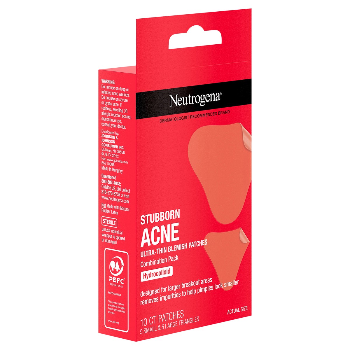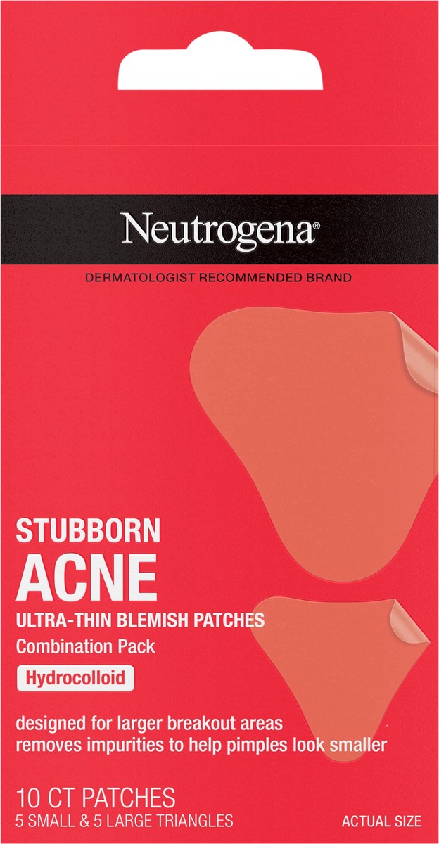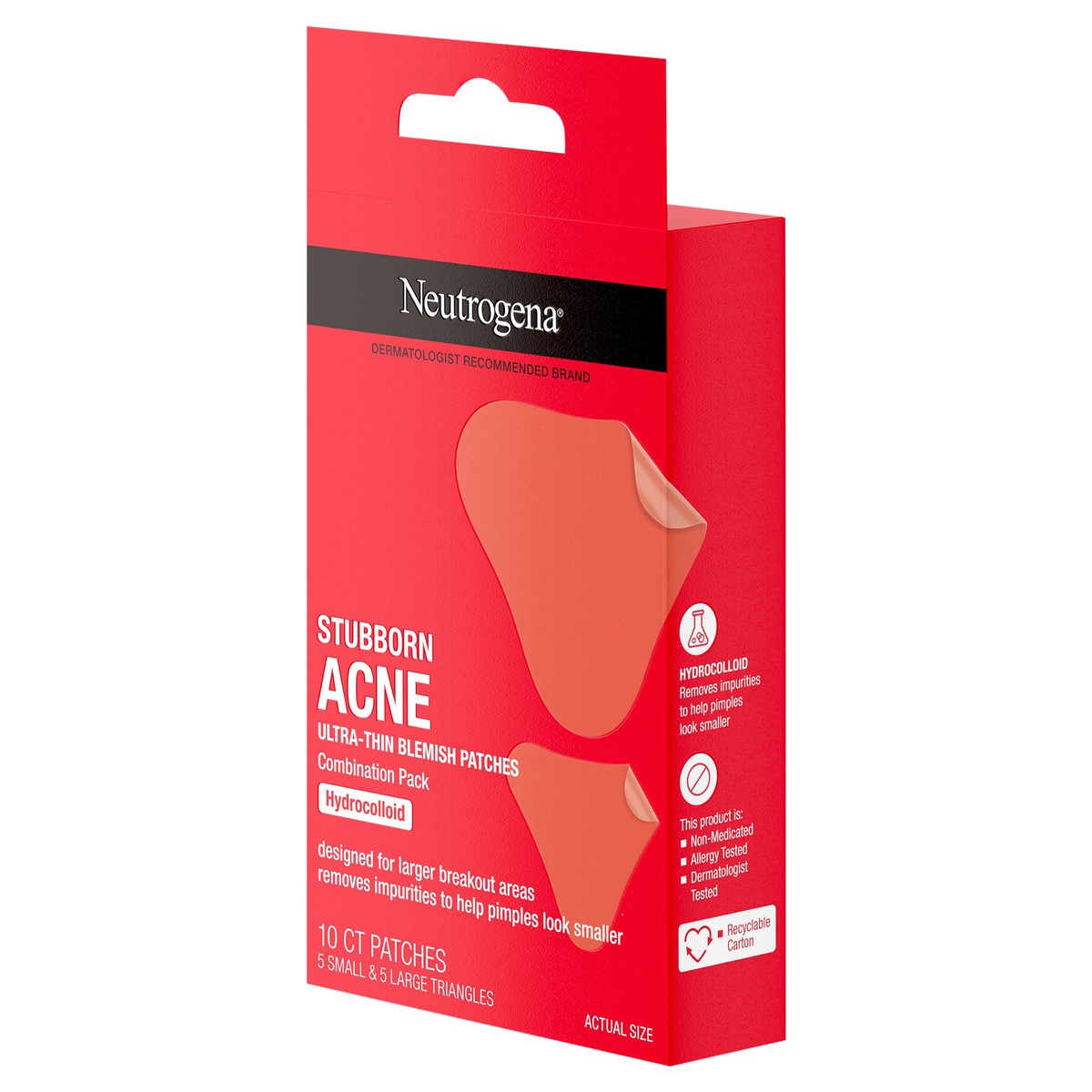 - Neutrogena Stubborn Ultra-Thin Acne Patches for face come in different sizesAcne patches visibly flatten the look of pimples overnightUltra-thin facial acne patches are designed to help prevent popped pimples from being pickedFluid-absorbing patches turn white while working to visibly show impurities being pulled from skinFacial patches are made with non-medicated ingredient hydrocolloidApply to dry