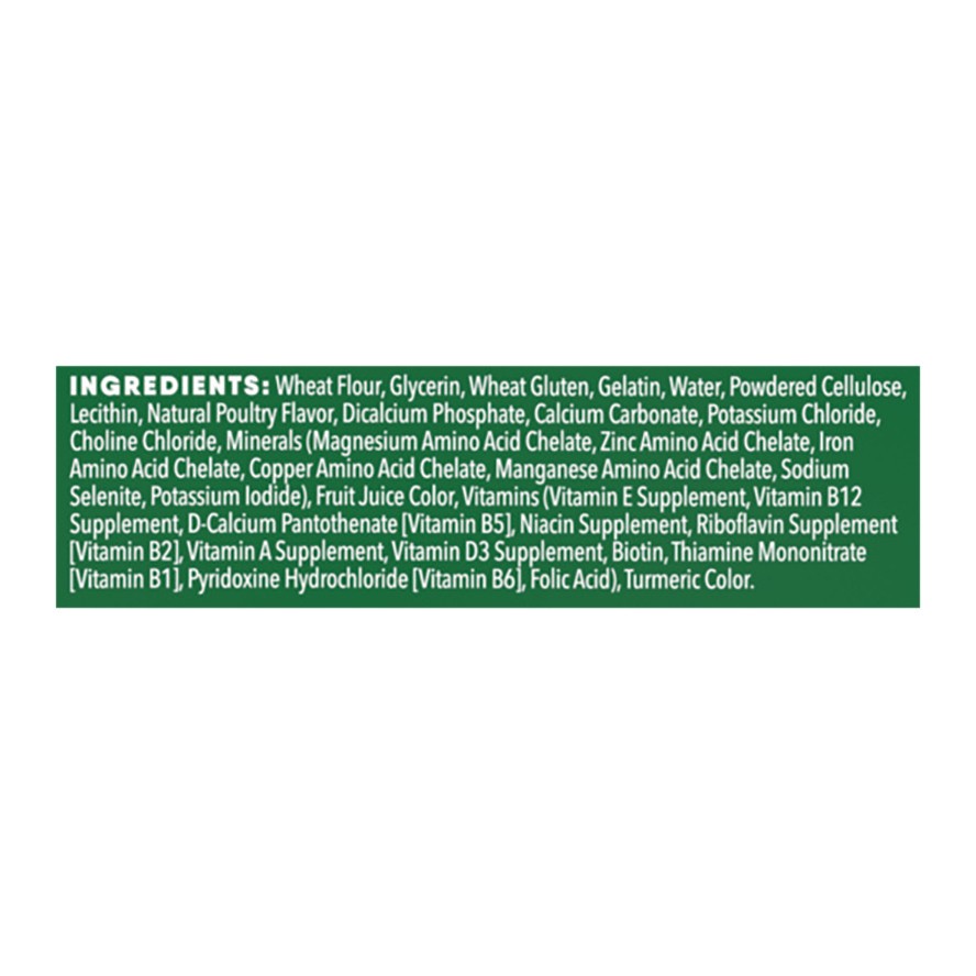 Wheat Flour, Glycerin, Wheat Gluten, Gelatin, Water, Powdered Cellulose, Lecithin, Natural Poultry Flavor, Dicalcium Phosphate, Calcium Carbonate, Potassium Chloride, Choline Chloride, Minerals (Magne…