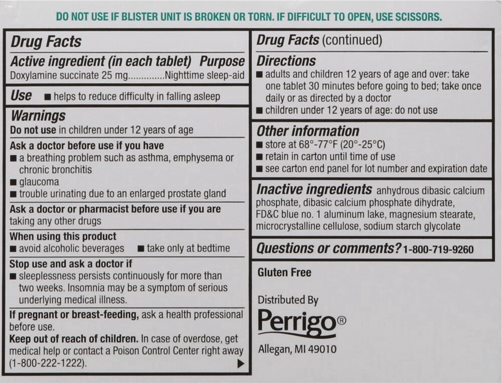 (In Each Tablet) Active Ingredients: Doxylamine Succinate (25 mg), Nighttime Sleep-Aid. Inactive Ingredients: Anhydrous Dibasic Calcium Phosphate, Dibasic Calcium Phosphate Dihydrate, FD&C Blue 1 Alum…