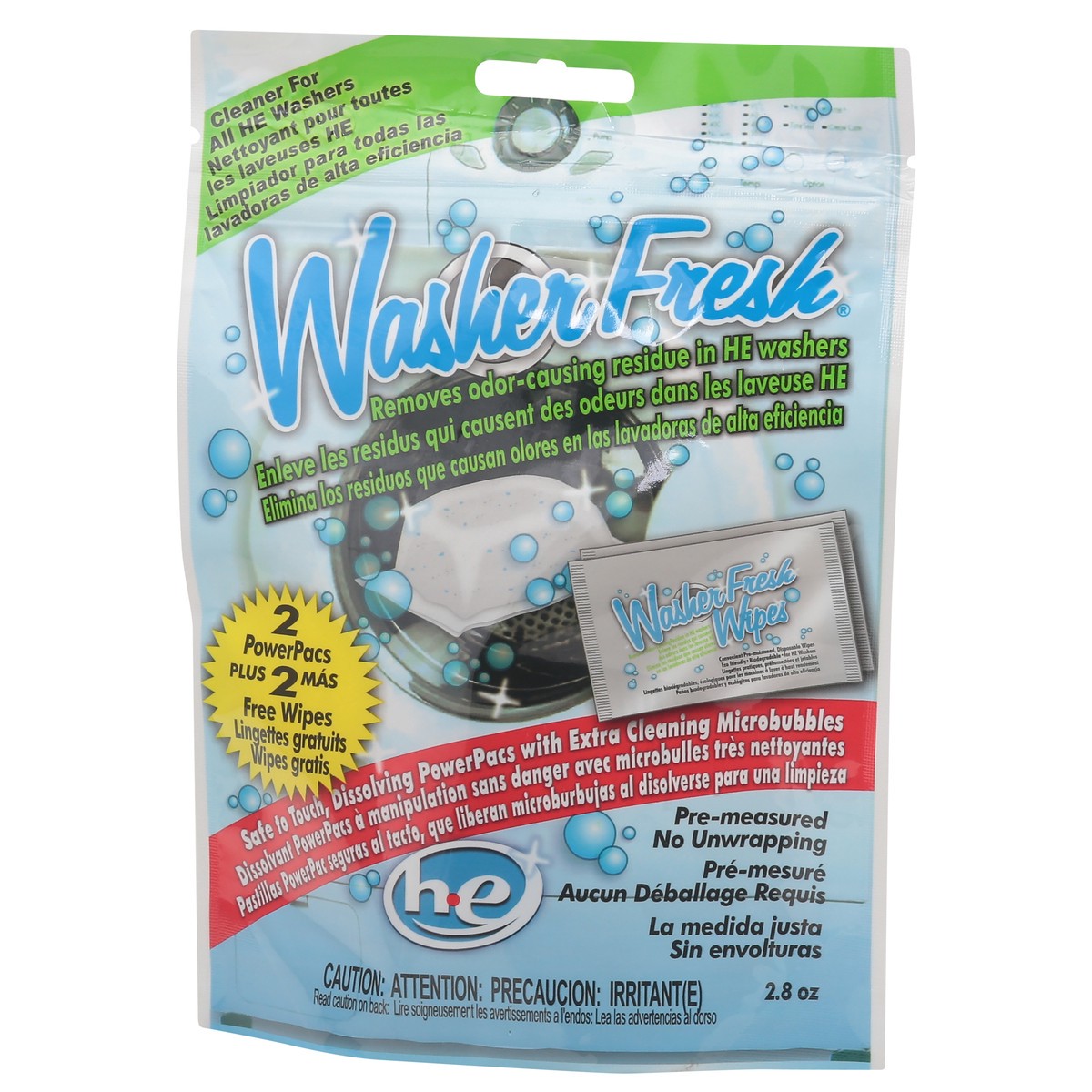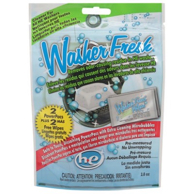 Cleaner for all HE washers. Removes odor-causing residue in HE washers. 2 PowerPacs plus 2 free Wipes. Water Fresh wipes. Safe to touch, dissolving PowerPacs with extra cleaning microbubles. Pre-measu…