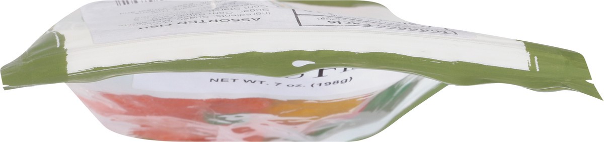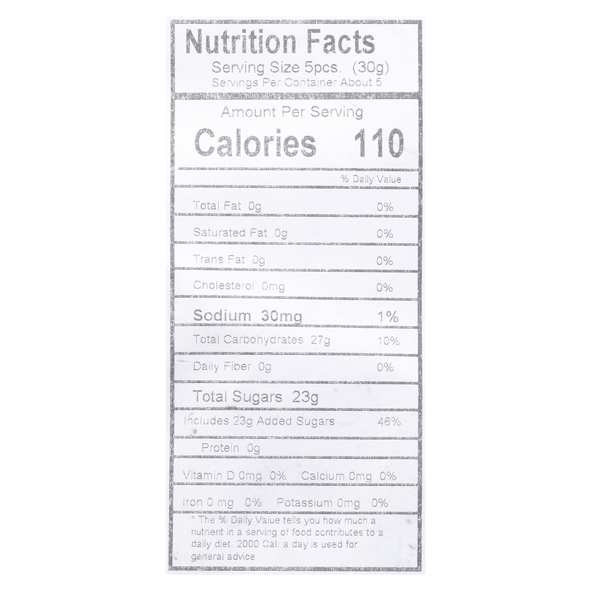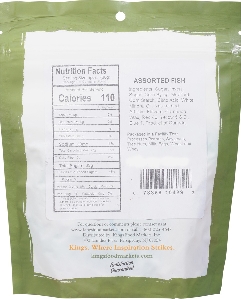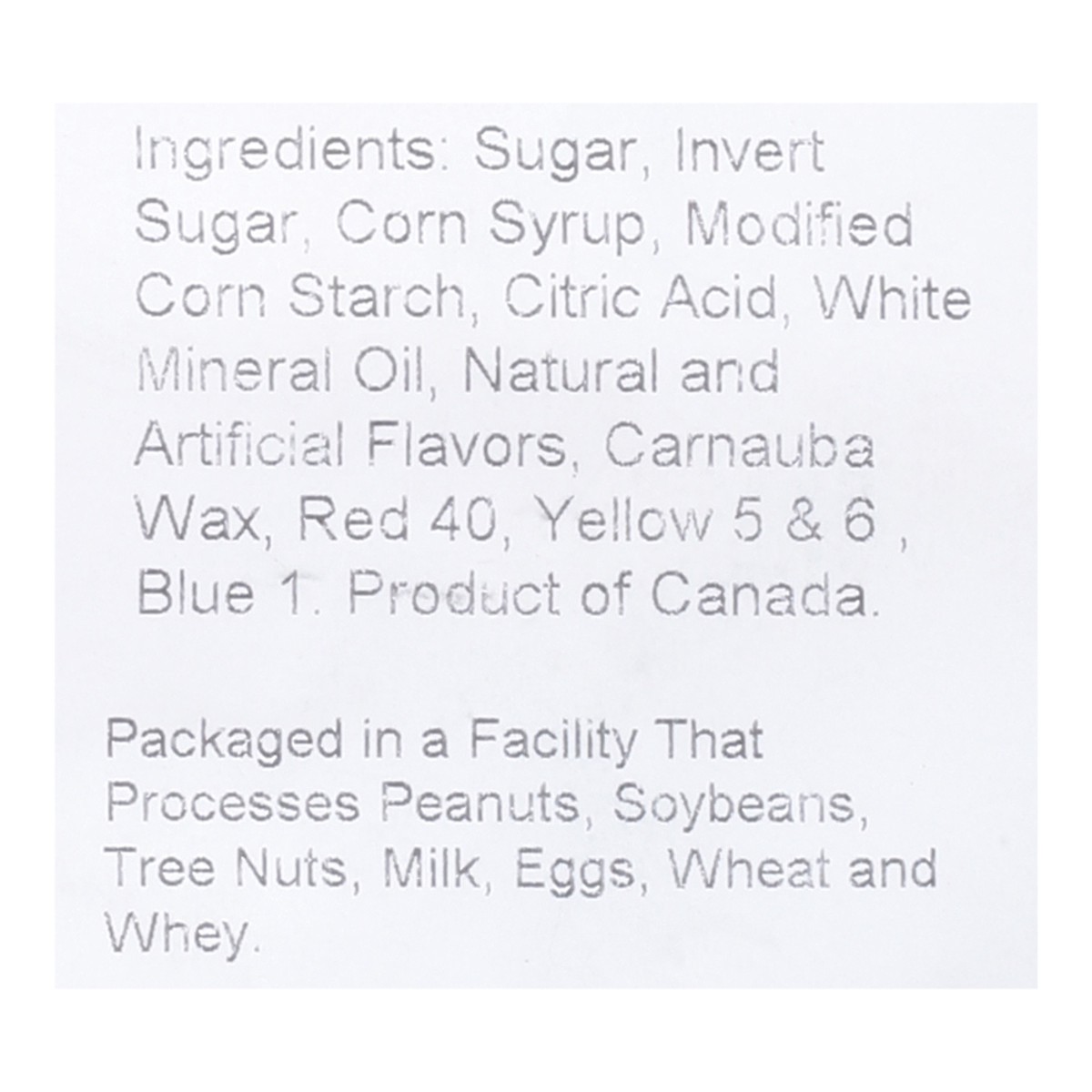 Sugar, Invert Sugar, Corn Syrup, Modified Corn Starch, Citric Acid, White Mineral Oil, Natural and Artificial Flavors, Carnauba Wax, Red 40, Yellow 5 & 6, Blue 1.