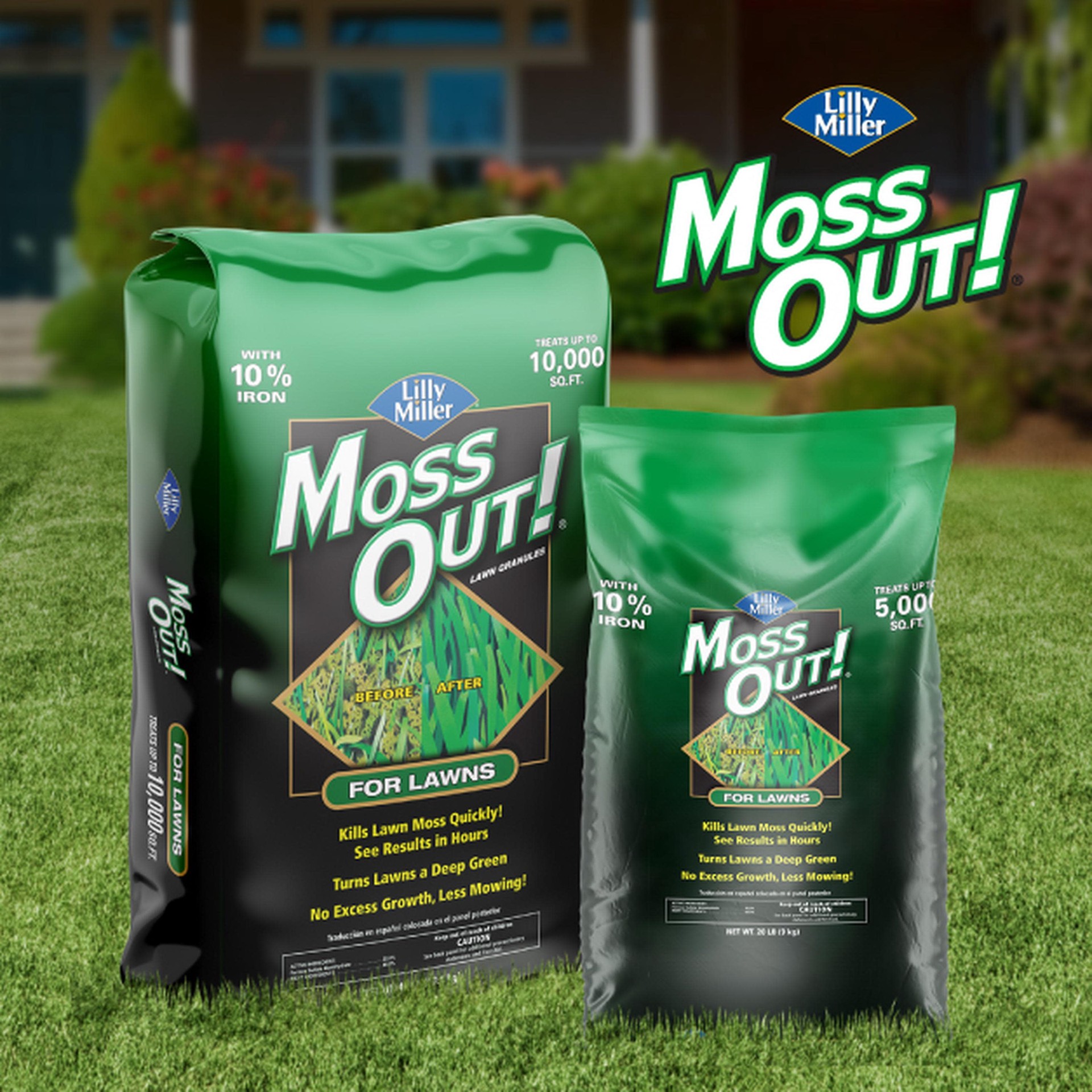 Kills lawn moss quickly. Turns lawns a deep green with no excess growth. 10% iron. Covers 5,000 Sq Ft. Recommended for use with gardens, landscape beds and lawns. Ready-to-use application.