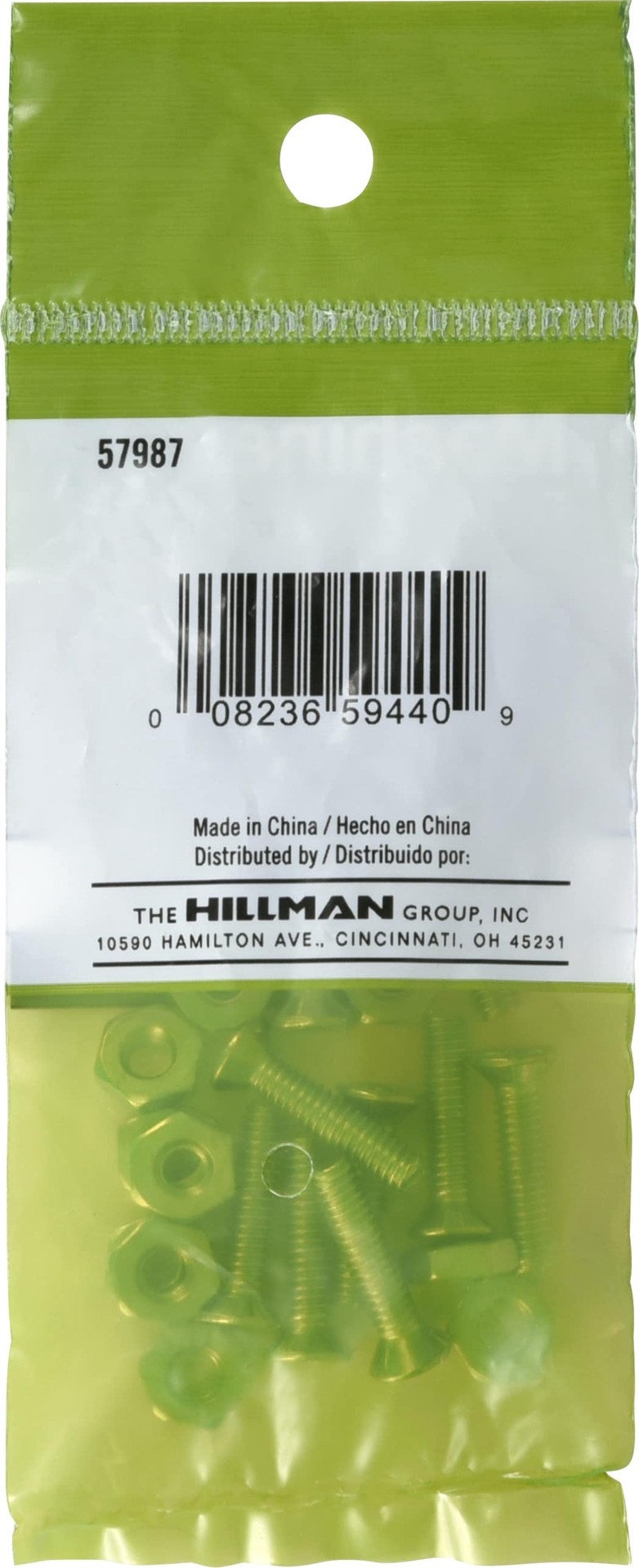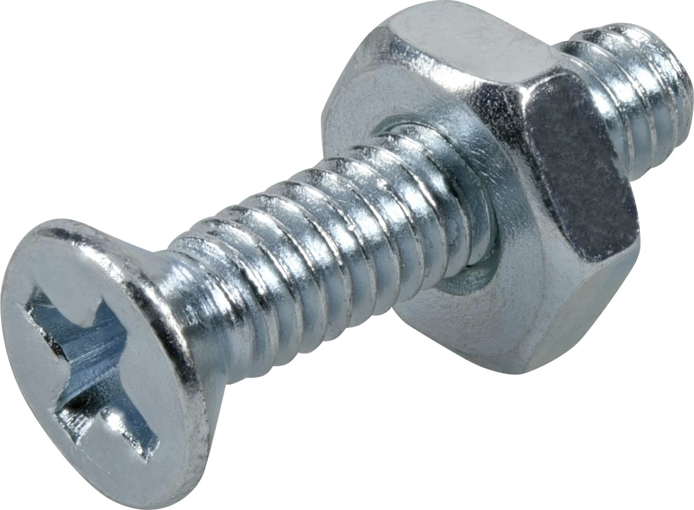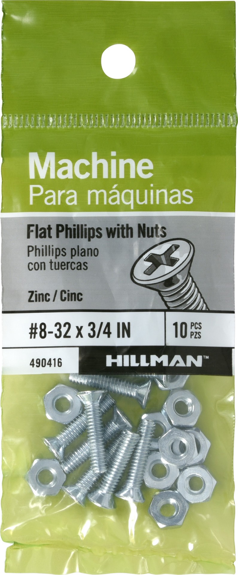 Common applications include machines, appliances, electronic devices, and vehicles. Flat-head Phillips machine screws with nuts. 10 pieces per retail package. Phillips drive.