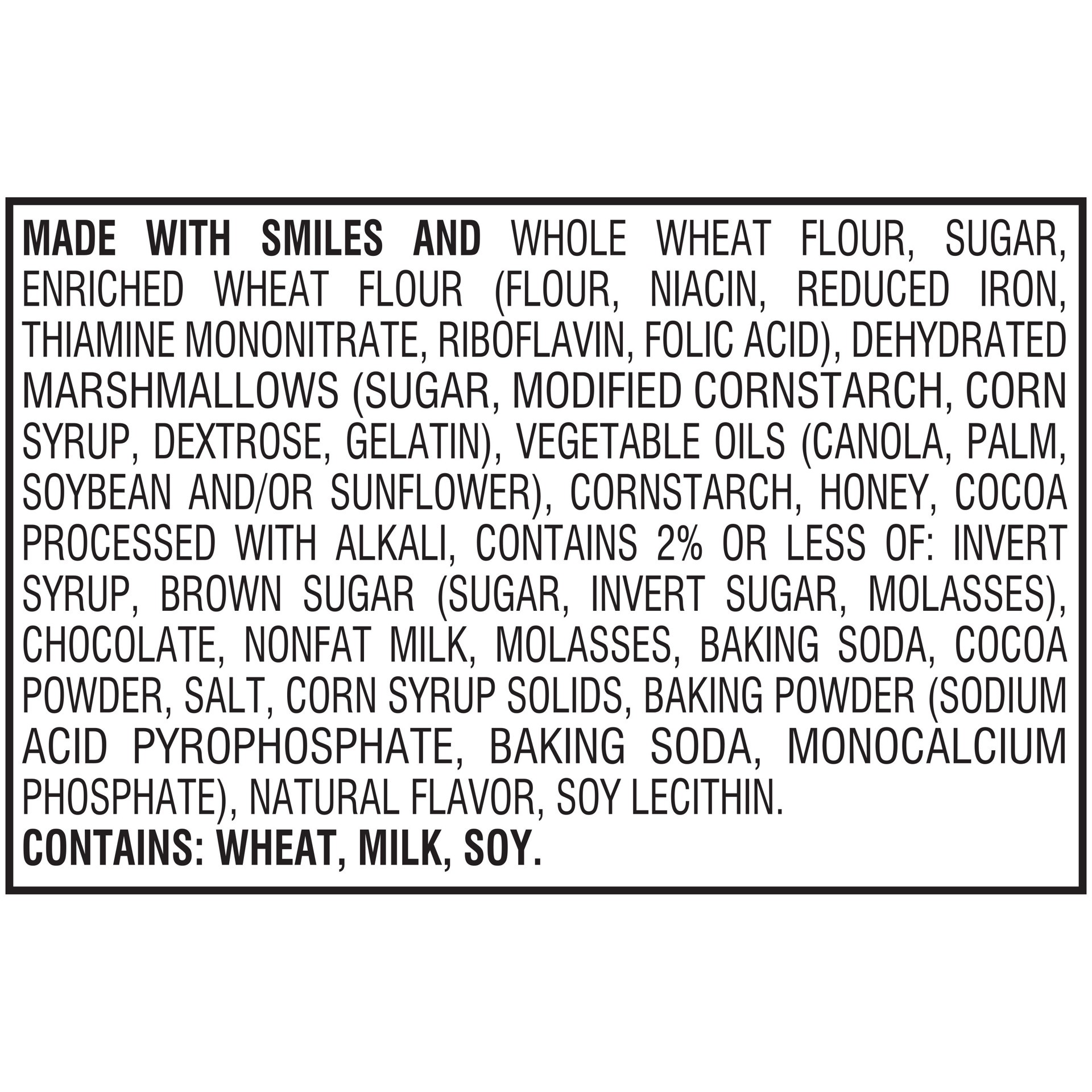 MADE WITH SMILES AND WHOLE WHEAT FLOUR, SUGAR, ENRICHED WHEAT FLOUR (FLOUR, NIACIN, REDUCED IRON, THIAMINE MONONITRATE, RIBOFLAVIN, FOLIC ACID), DEHYDRATED MARSHMALLOWS (SUGAR, MODIFIED CORNSTARCH, CO…