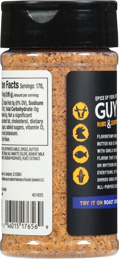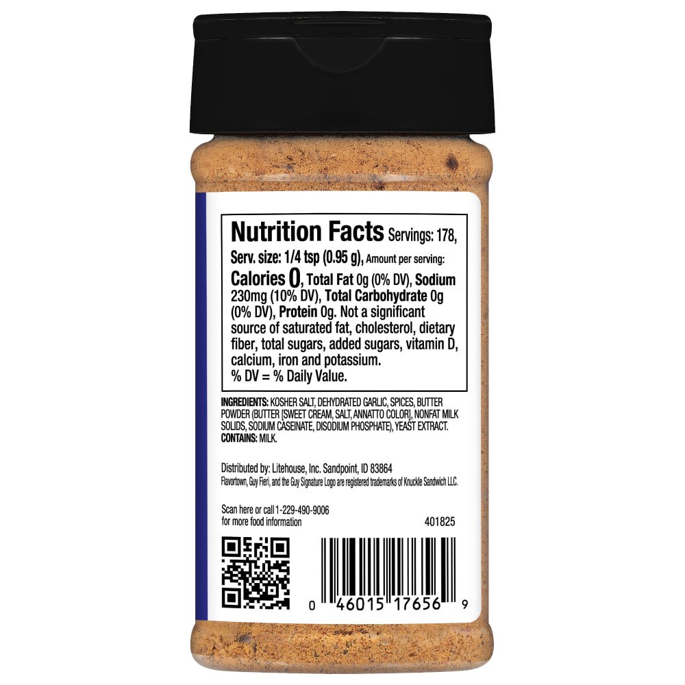 Kosher Salt, Dehydrated Garlic, Spices, Butter Powder (Butter [Sweet Cream, Salt, Annatto Color], Nonfat Milk Solids, Sodium Caseinate, Disodium Phosphate), Yeast Extract.