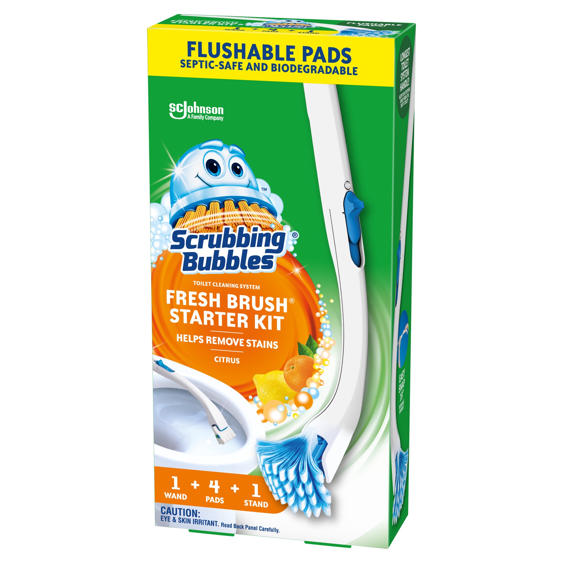 Flushable pads septic-safe and biodegradable. Helps remove stains. SC Johnson A family company. A family company since 1886. - Fisk Johnson. Longest Toilet System Handle! Keeps you further away from t…