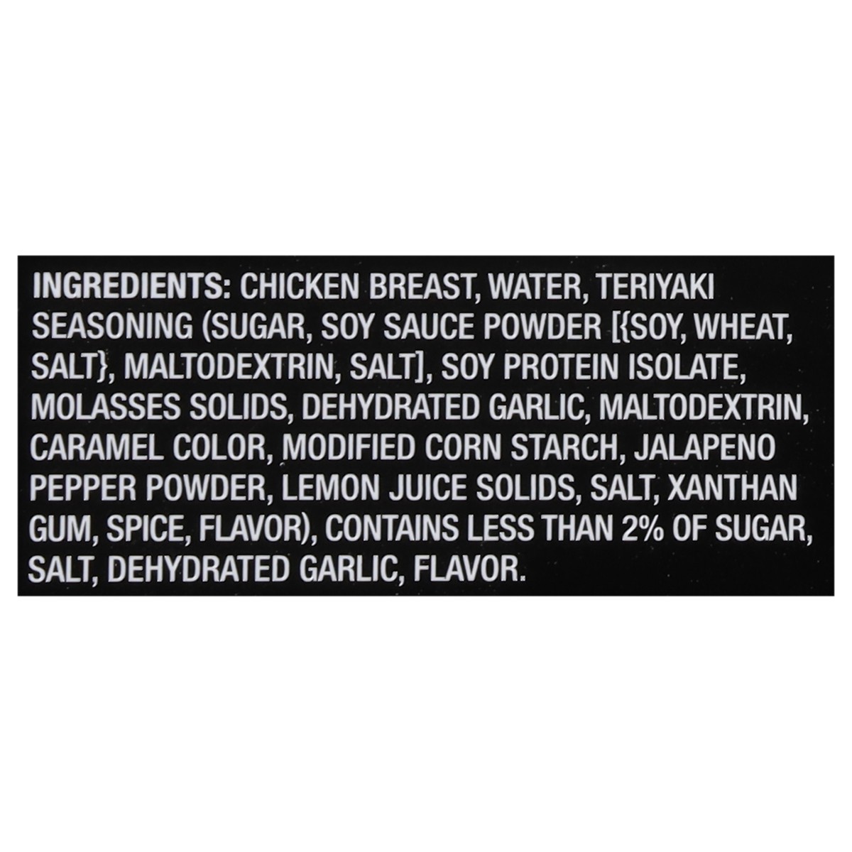 Chicken Breast, Water, Teriyaki Seasoning (Sugar, Soy Sauce Powder [{Soy, Wheat, Salt}, Maltodextrin, Salt], Soy Protein Isolate, Molasses Solids, Dehydrated Garlic, Maltodextrin, Caramel Color, Modif…
