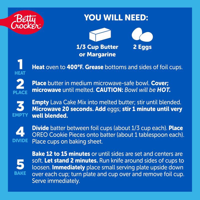 - CONTAINS: One 8.3 oz box of Betty Crocker OREO Lava Cake Mix; Makes 4 individual-size lava cakes