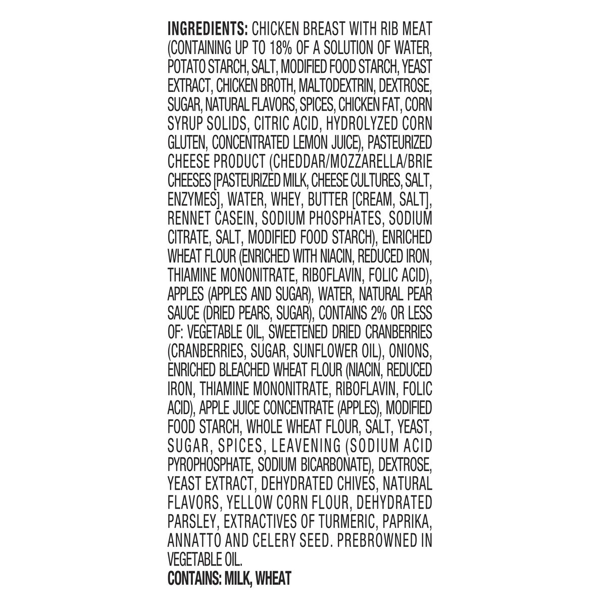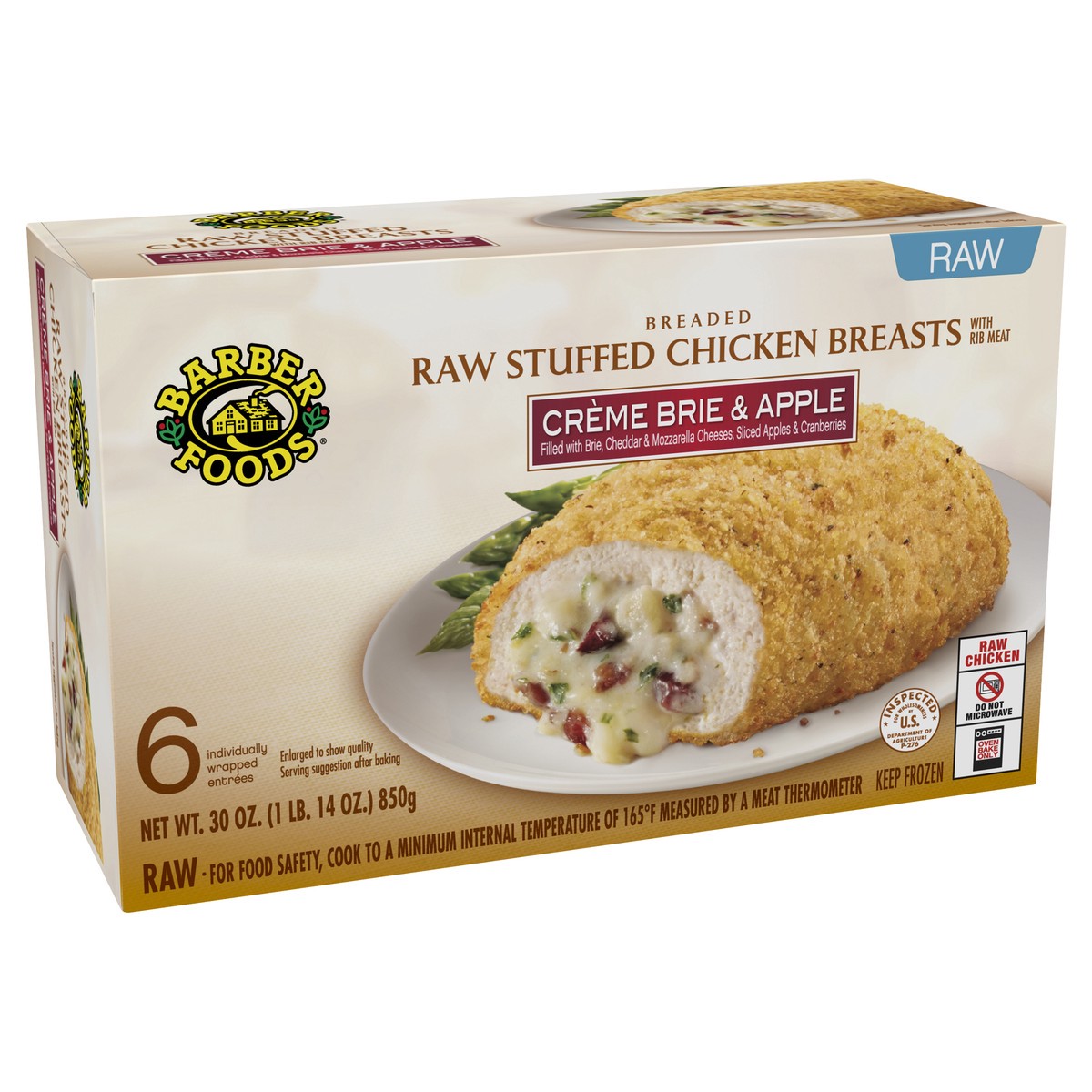 - One 30 oz package of 6 Breaded Raw Stuffed Chicken Breasts Creme Brie and Apple