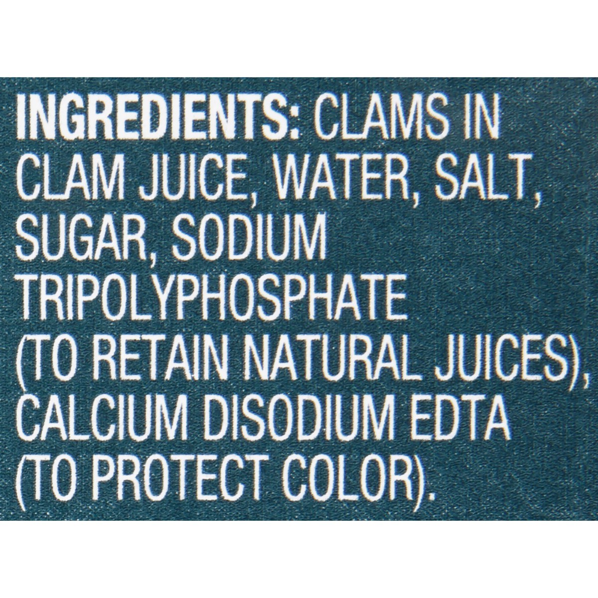 Clams in Clam Juice, Water, Salt, Sugar, Sodium Tripolyphosphate (to Retain Natural Juices), Calcium Disodium EDTA (to Protect Color).
