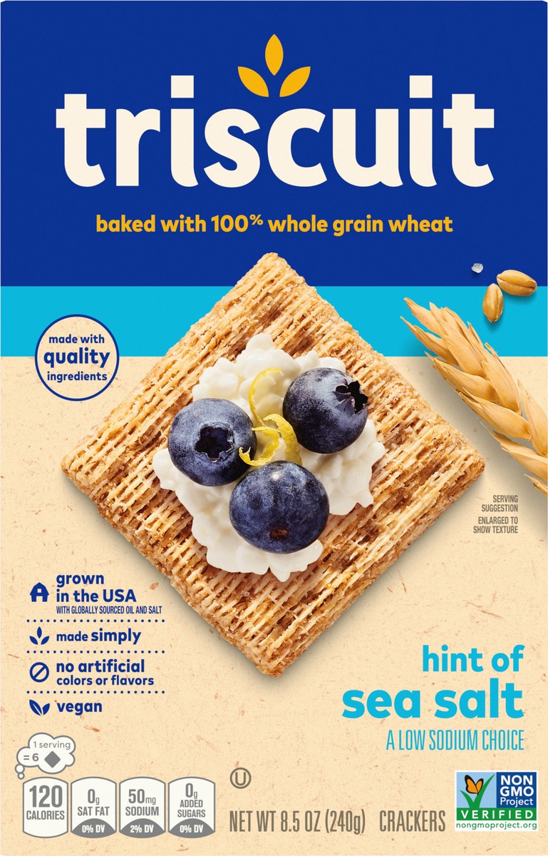 Savor the simplicity of Triscuit Hint of Sea Salt Whole Grain Wheat Crackers. Baked with 100% whole grain wheat, these cracker snacks have a hint of sea salt allowing their natural flavor to shine thr…