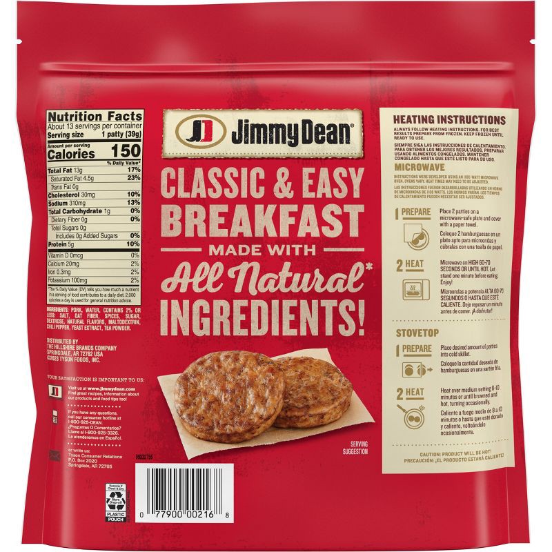 - One 18.3 oz bag containing approximately 13 Jimmy Dean All Natural Original Fully Cooked Pork Sausage Patties
