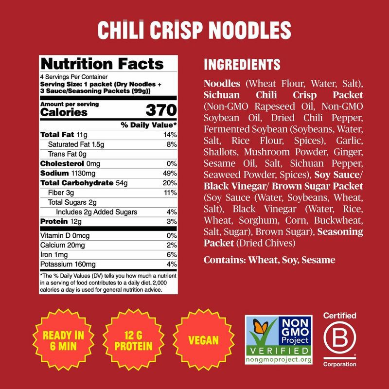 Noodles (Wheat Flour, Water, Salt), Sichuan Chill Crisp Packet (Non-GMO Rapeseed Oil, Non-GMO Soybean Oil, Dried Chili Pepper, Fermented Soybean (Soybeans, Water, Salt, Rice Flour, Spices), Garlic, Sh…