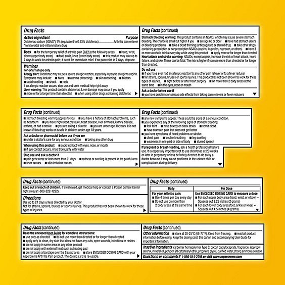 Active Ingredients: *Diclofenac Sodium (NSAID) (Equivalent to 0.93% Diclofenac) (1 %), Arthritis Pain Reliever. Inactive Ingredients: Carbomer Homopolymer Type C, Cocoyl Caprylocaprate, Isopropyl Alco…