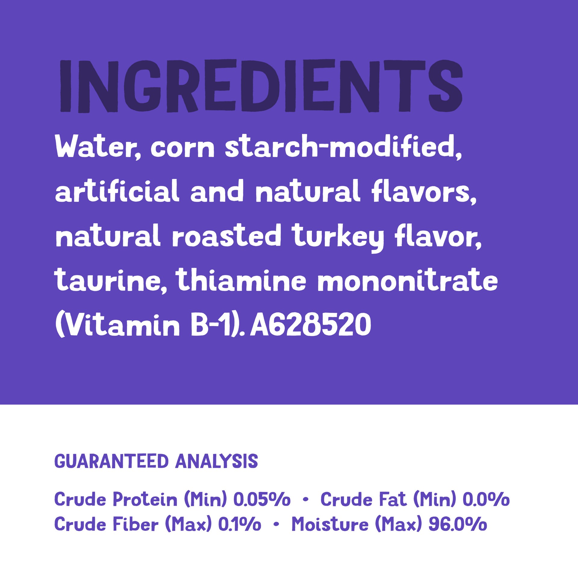 Water, Corn Starch, Artificial and Natural Flavors, Artificial Turkey Flavor, Taurine, Thiamine Mononitrate (Vitamin B-1). B628523.