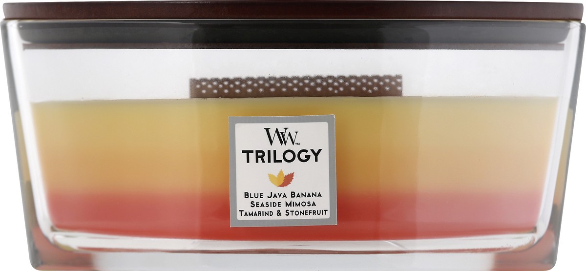Blue java banana. Seaside mimosa. Tamarind & stone fruit Trilogy. Crackles as it burns. WoodWick is the number one premium wooden wick candle sold in the USA. Creates the soothing sound of a crackling…