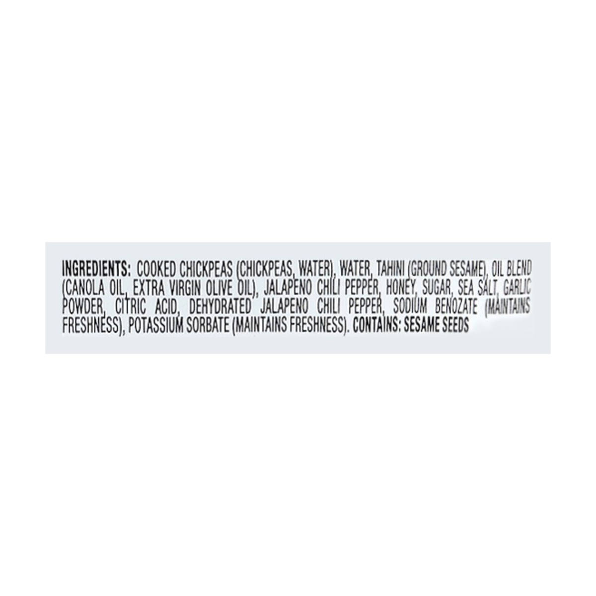 Cooked Chickpeas (Chickpeas, Water), Water, Tahini (Ground Sesame), Oil Blend (Canola Oil, Extra Virgin Olive Oil), Jalapeno Chili Pepper, Honey, Sugar, Sea Salt, Garlic Powder, Citric Acid, Dehydrate…