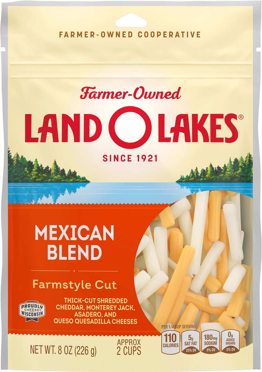 - SHREDDED MEXICAN BLEND CHEESE: Turn every night into Taco Tuesday with Land O Lakes Mexican Blend Farmstyle Shreds; An excellent melting cheese blend that combines Cheddar, Monterey Jack, Asadero, & Queso Quesadilla cheeses