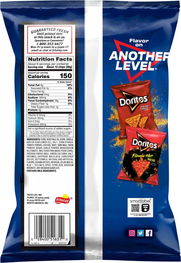 Guaranteed fresh until printed date or this snack's on us. fritolay.com. SmartLabel: Scan for more food information or call 1-800-352-4477. Instagram. Twitter. Facebook. Questions or comments? 1-800-3…