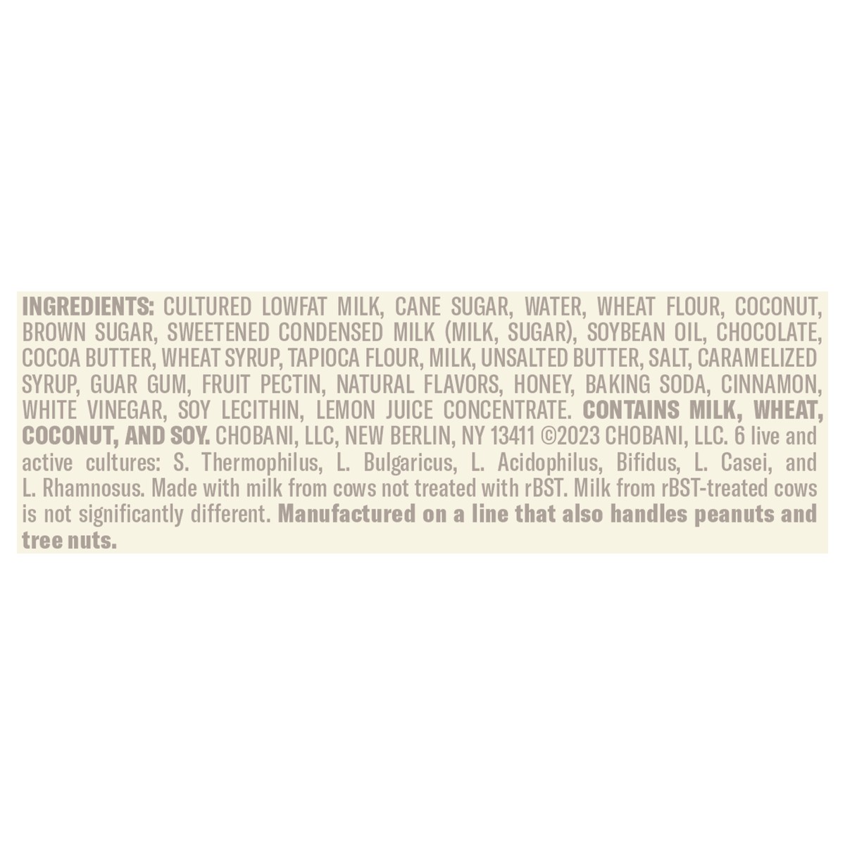 Cultured Lowfat Milk, Cane Sugar, Water, Wheat Flour, Coconut, Brown Sugar, Sweetened Condensed Milk (Milk, Sugar), Soybean Oil, Chocolate, Cocoa Butter, Wheat Syrup, Tapioca Flour, Milk, Unsalted But…