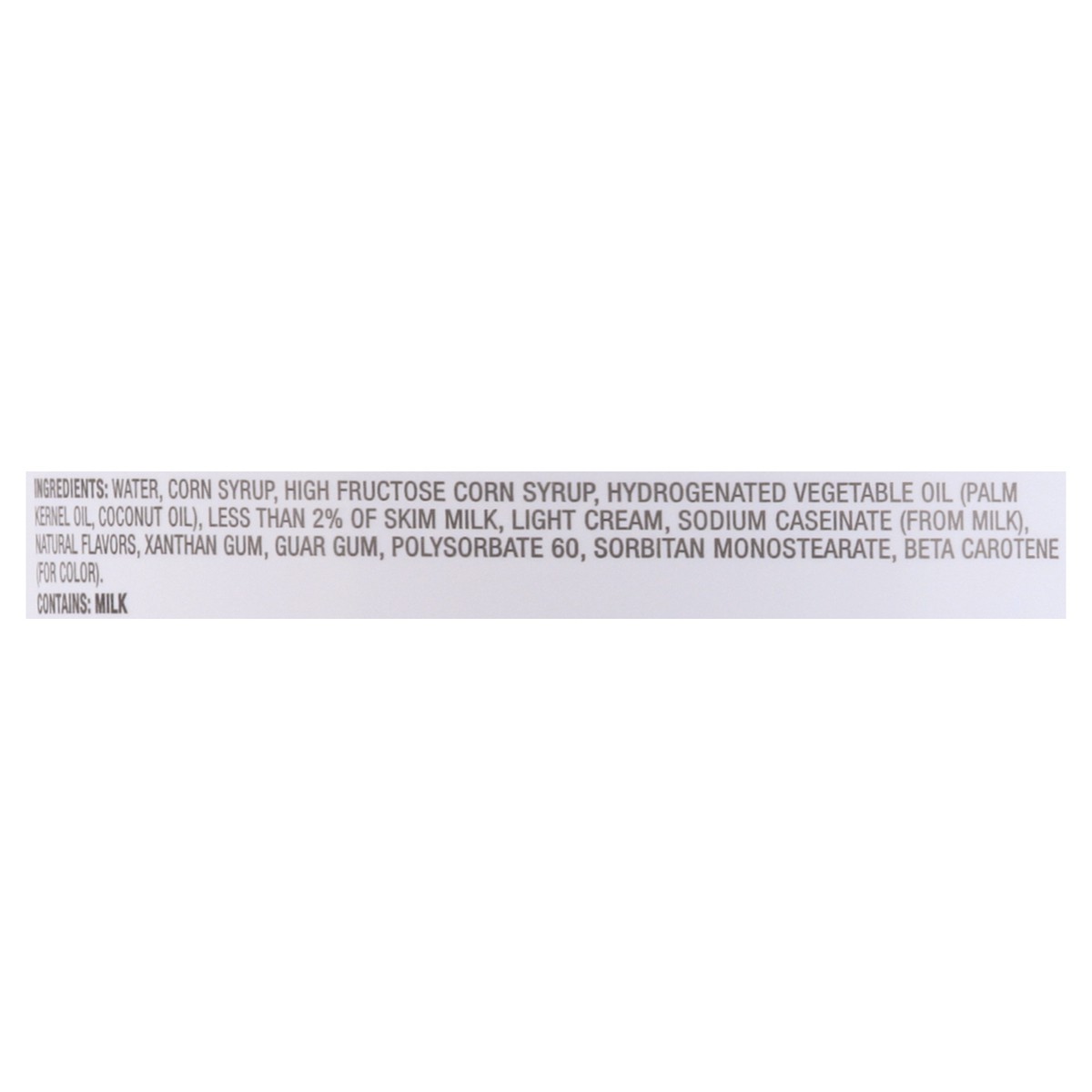 Water, Corn Syrup, High Fructose Corn Syrup, Hydrogenated Vegetable Oil (Palm Kernel Oil, Coconut Oil), Less than 2% of Skim Milk, Light Cream, Sodium Caseinate (from Milk), Natural Flavors, Xanthan G…