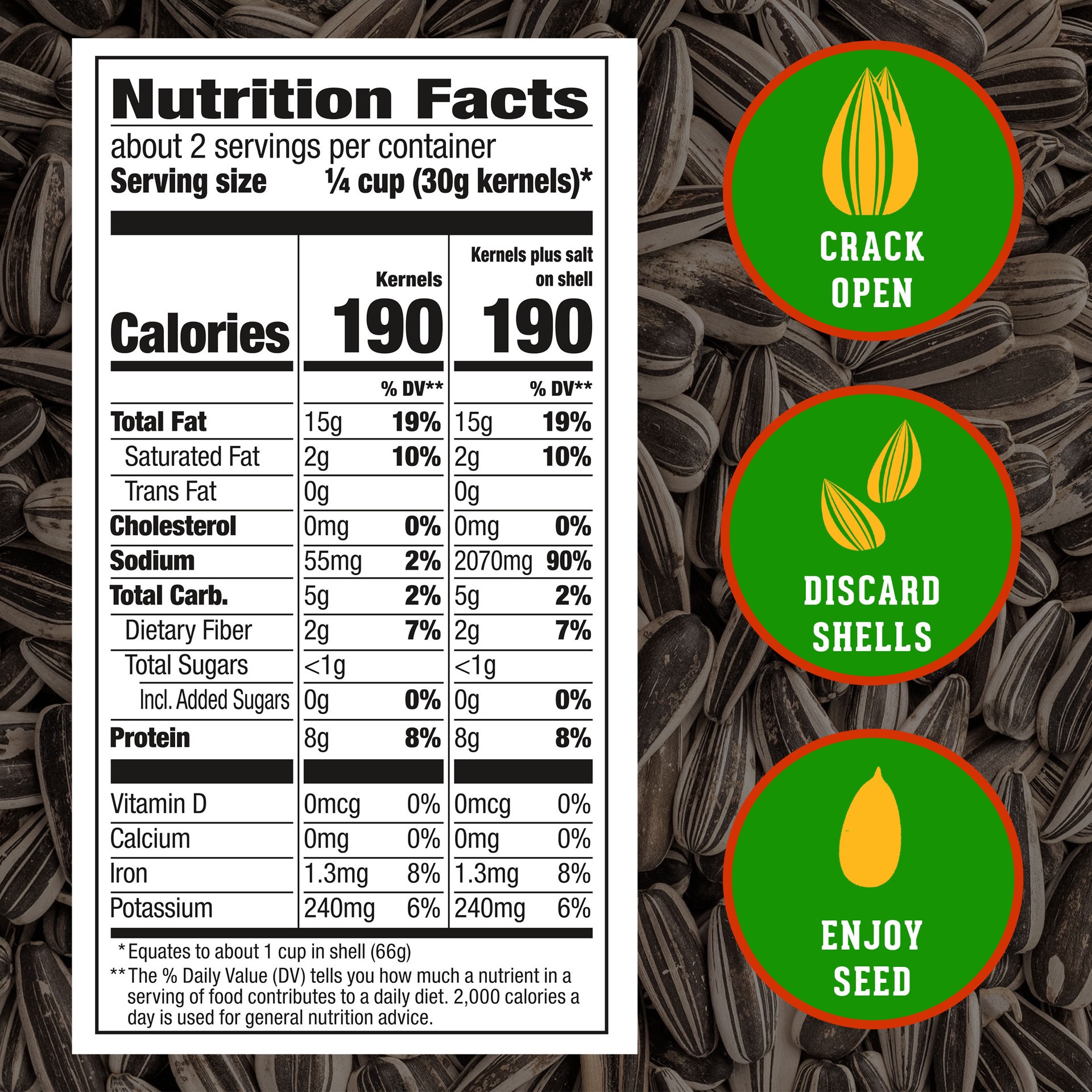 DAVID Reduced Sodium Salted and Roasted Jumbo Sunflower Seeds are delicious sunflower seeds that are fun to eat anytime, anywhere and are bigger than the normal sized DAVID sunflower seeds. These jumb…
