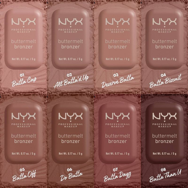 - NYX Professional Makeup Buttermelt Bronzer: a Buttery Soft Powder Bronzer, the NYX Professional Makeup Buttermelt Bronzer formula melts into skin delivering a buttered up bronzed finish and silky-smooth skin, both fade and transfer resistant. For a sun-soaked bronze all year round, and all day long! Cooler shades make for a perfect powder contour.