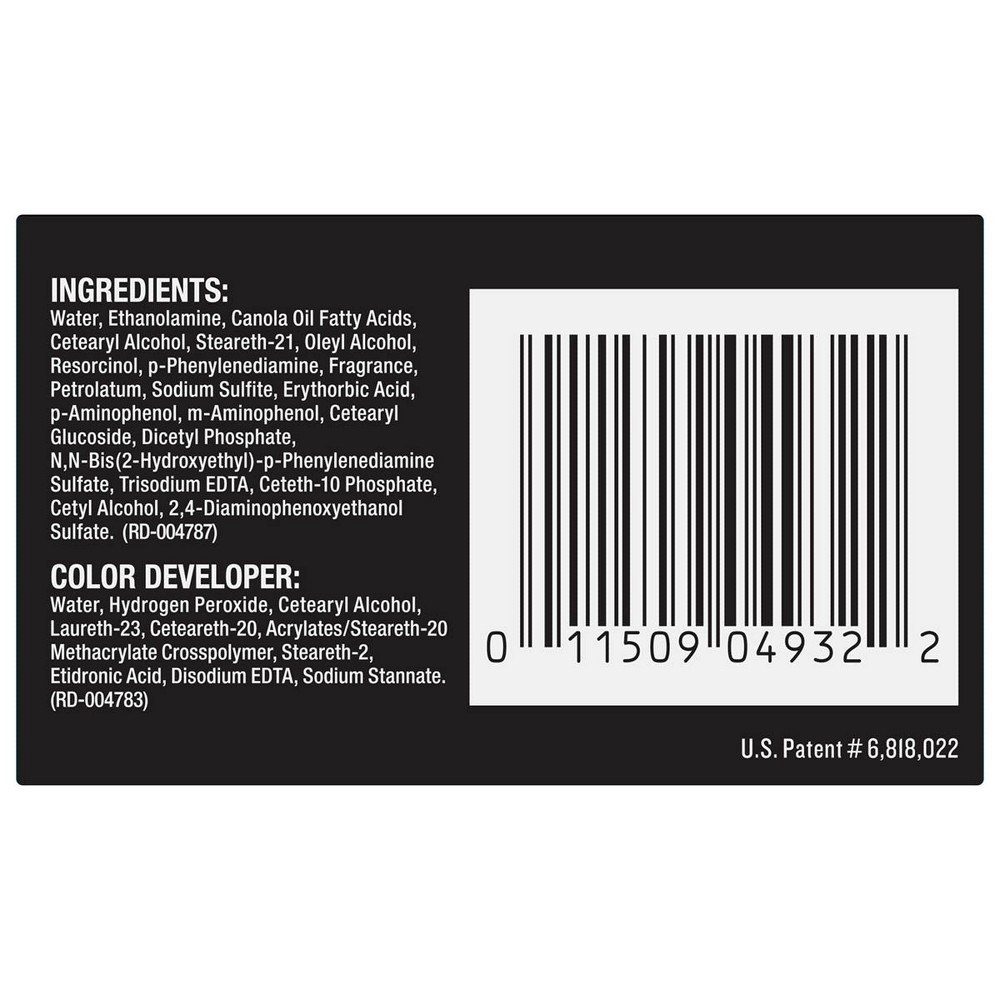 Color Base: Water, Ethanolamine, Canola Oil Fatty Acids, Cetearyl Alcohol, Steareth-21, Oleyl Alcohol, Resorcinol, P-Phenylenediamine, Keratin, Olea Europaea (Olive) Fruit Oil, Tocopheryl Acetate, Fra…