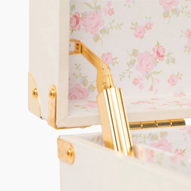- Beautifully crafted from composite wood with a soft, floral fabric-lined interior