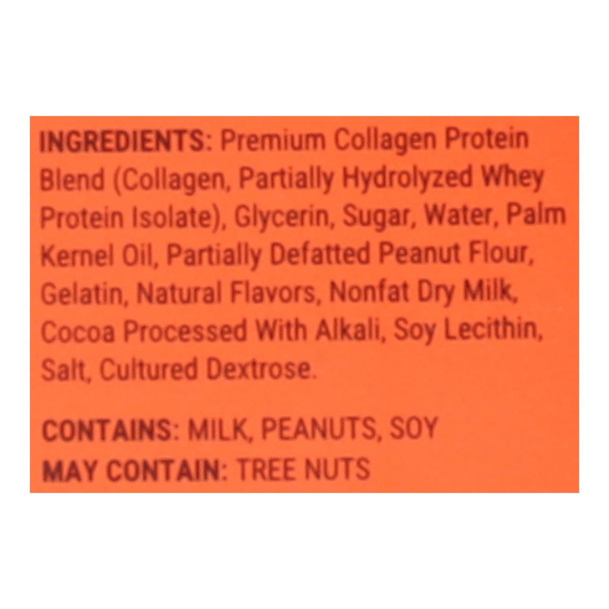 Premium Collagen Protein Blend (Collagen, Partially Hydrolyzed Whey Protein Isolate), Glycerin, Sugar, Water, Palm Kernel Oil, Partially Defatted Peanut Flour, Gelatin, Natural Flavors, Nonfat Dry Mil…