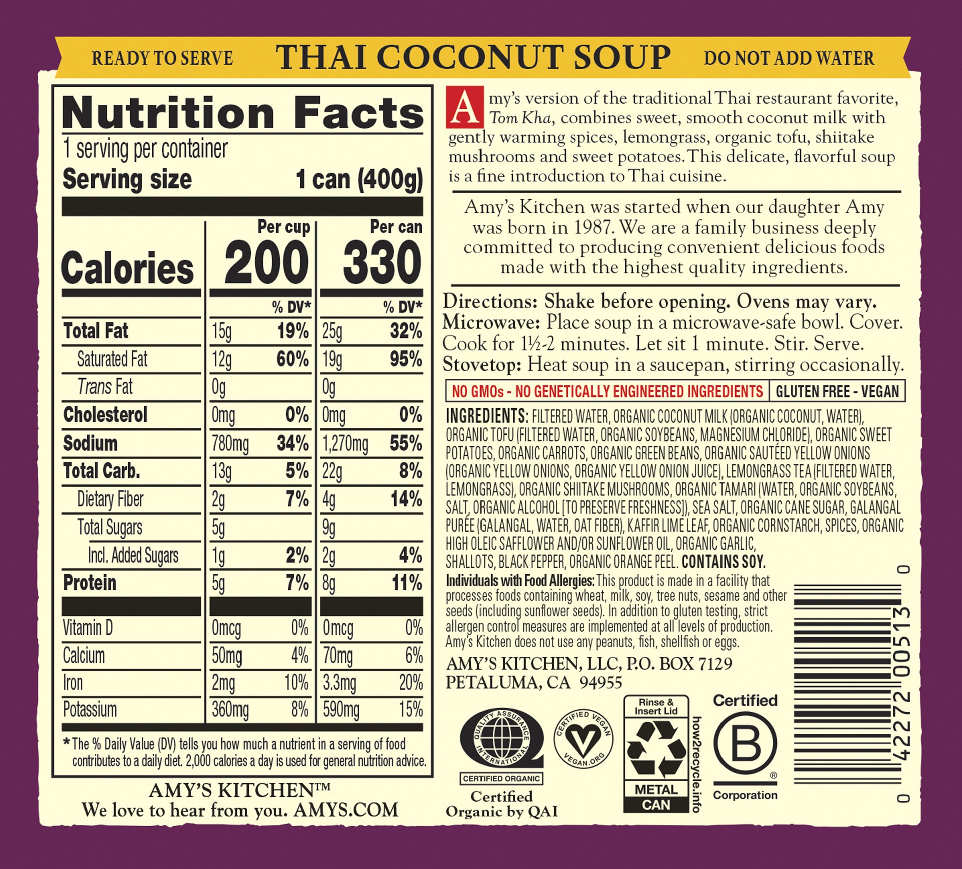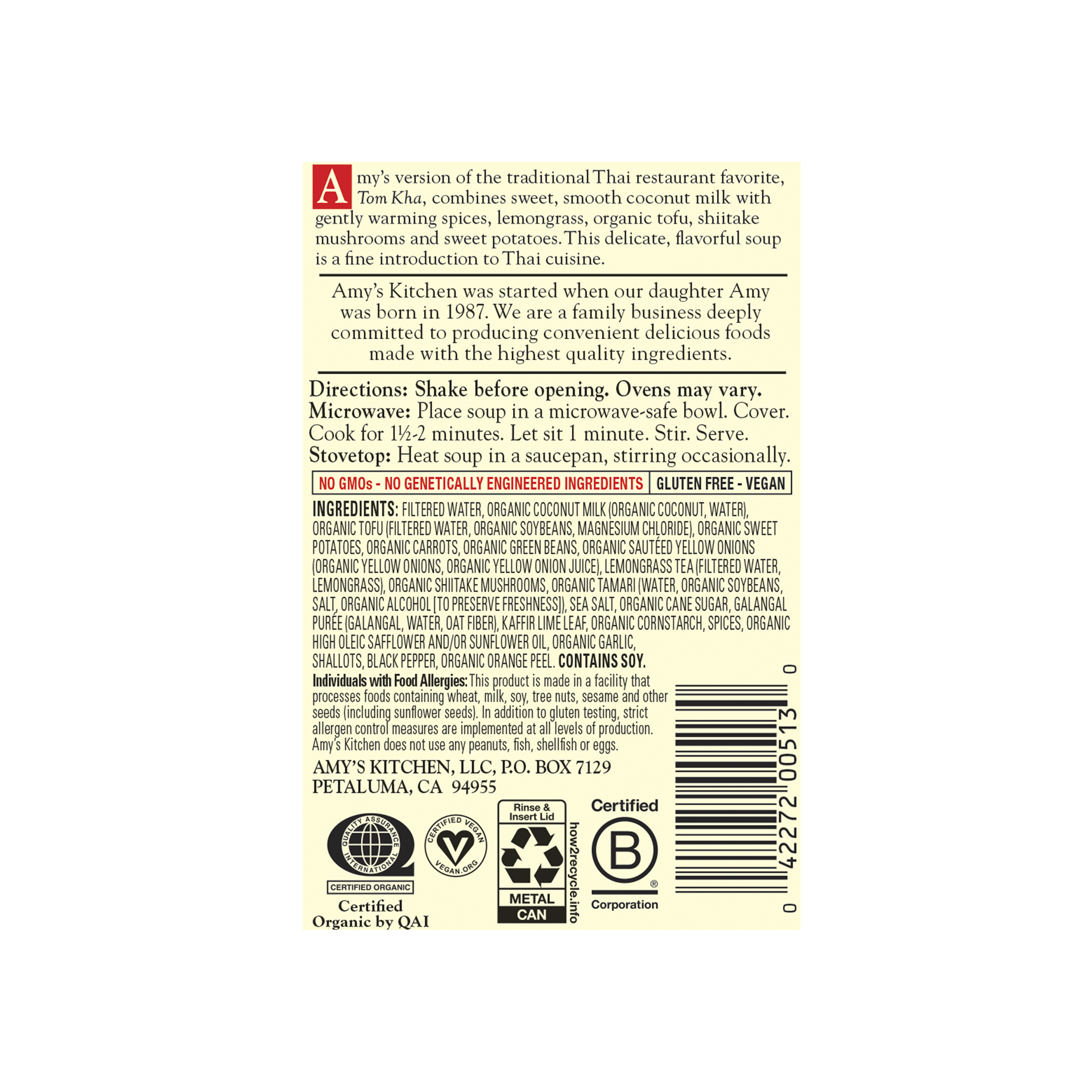 Ready to serve. Amy's version of the traditional Thai restaurant favorite, Tom Kha, combines sweet, smooth coconut milk with gently warming spices, lemongrass, organic tofu, shiitake mushrooms and swe…
