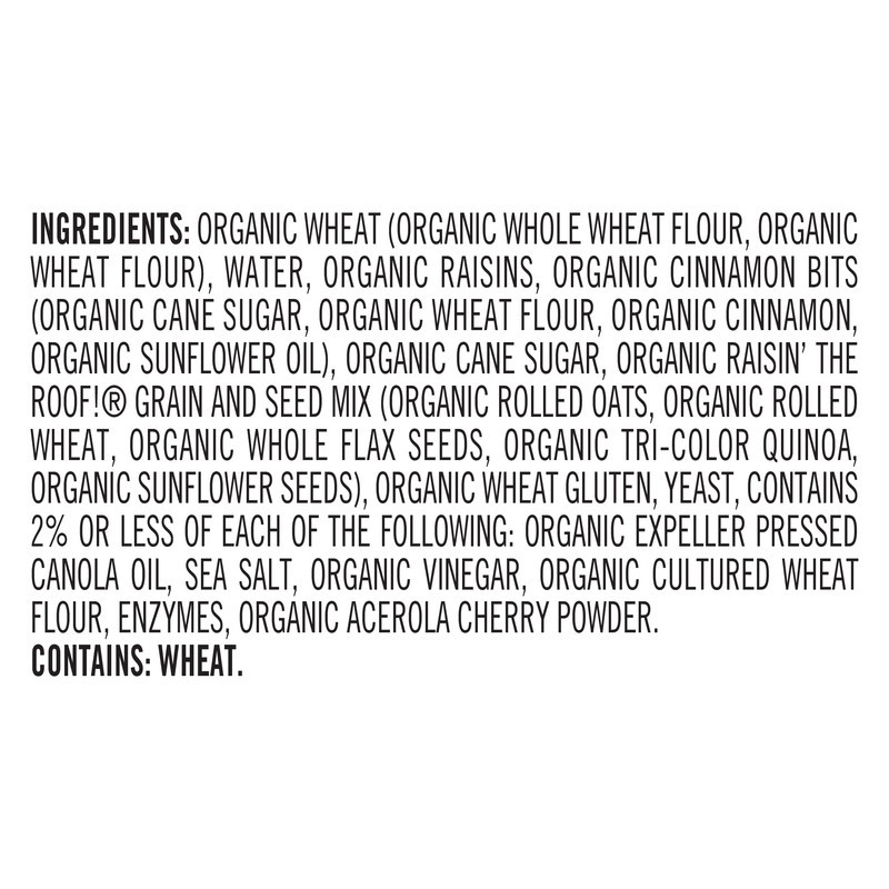 Organic Wheat (Organic Whole Wheat Flour, Organic Wheat Flour), Water, Organic Raisins, Organic Raisins the Roof! Grain and Seed Mix (Organic Rolled Oats, Organic Rolled Wheat, Organic Whole Flax Seed…
