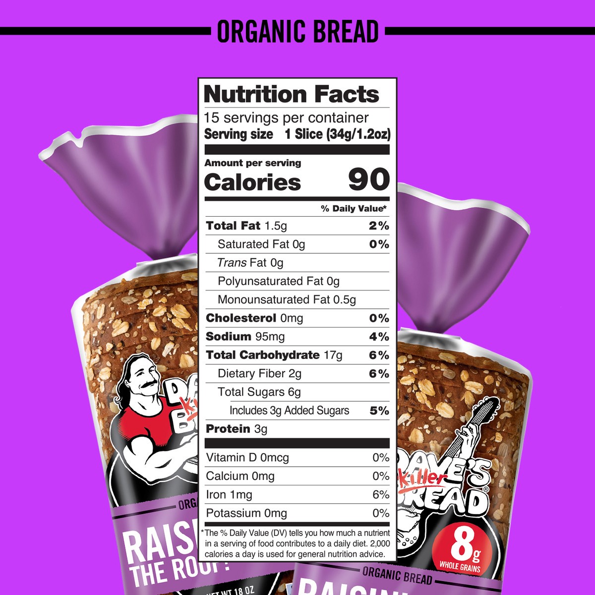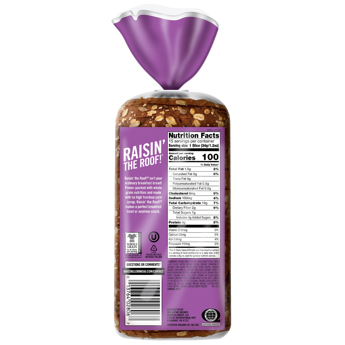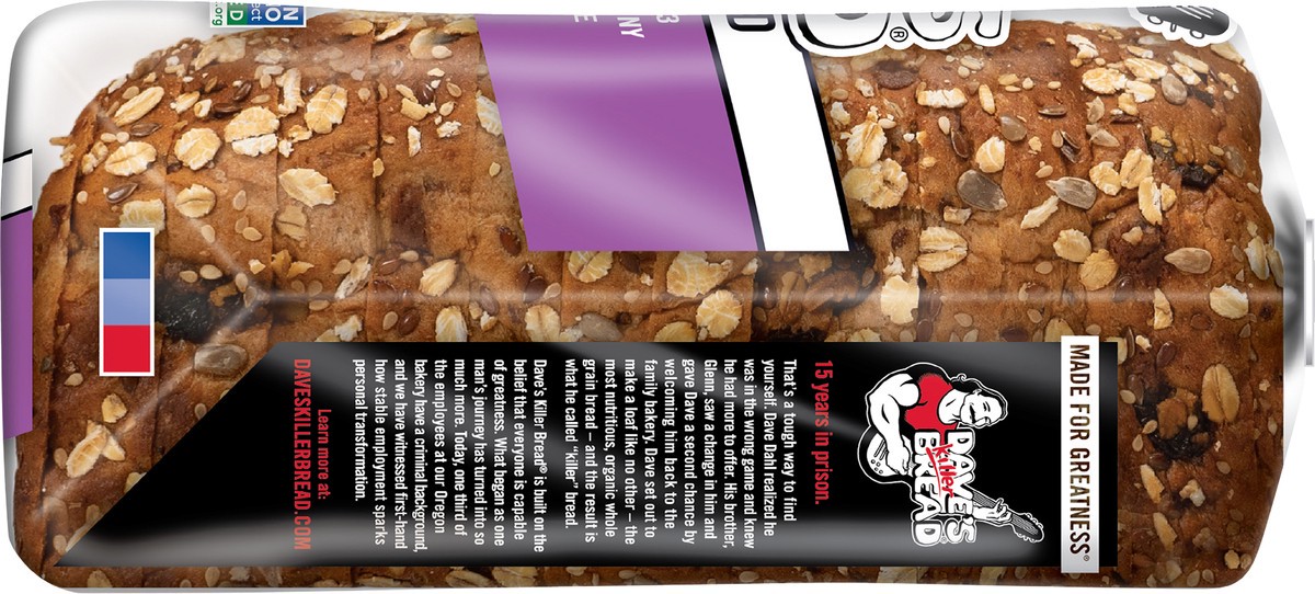 Dave's Killer Bread Raisin' The Roof! bread loaf is the sweet and cinnamony USDA organic breakfast bread raisin' the roof on the basic breakfast experience! Each slice of this Non-GMO Project Verified…