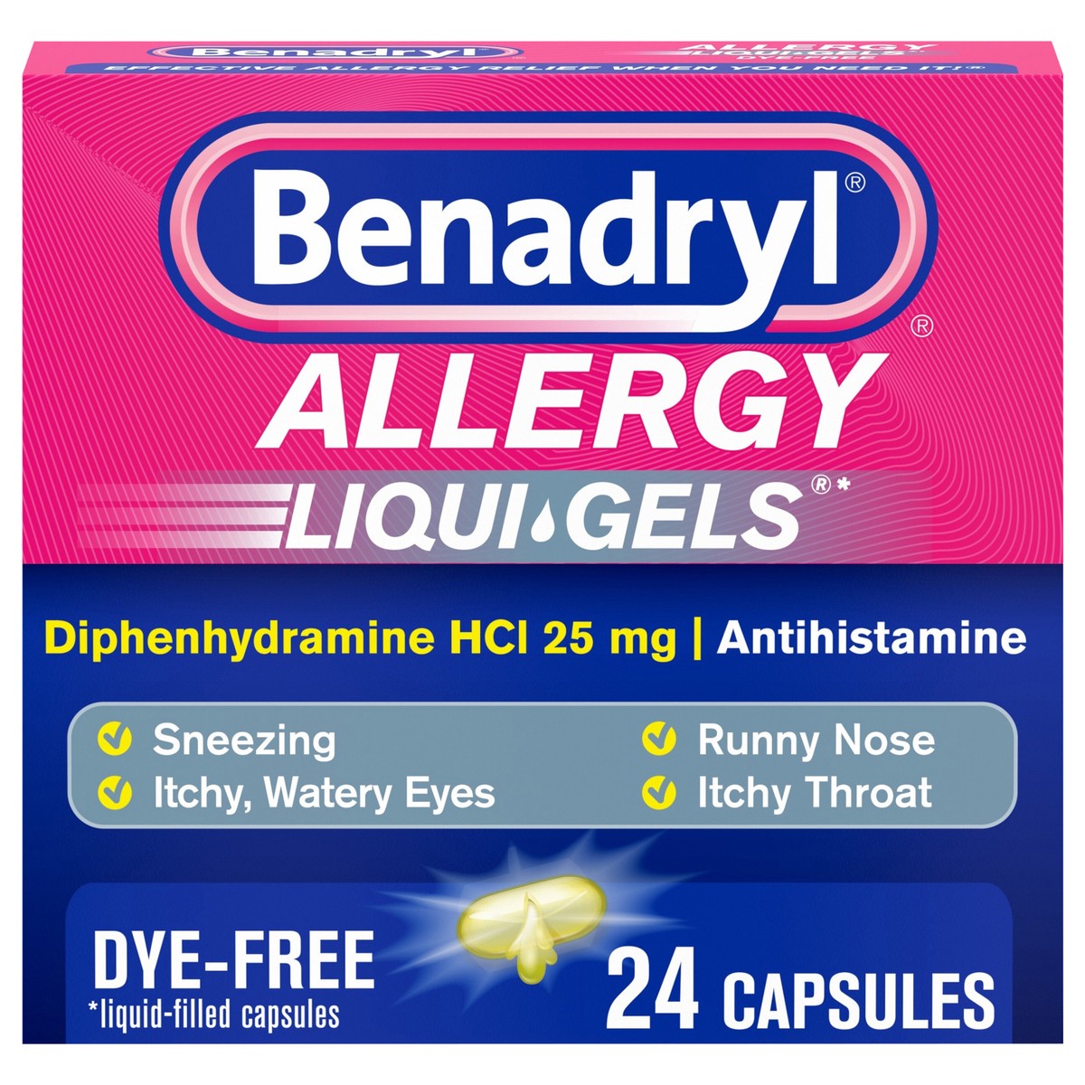 - Benadryl Dye-Free Liqui-Gels Antihistamine Allergy Medicine for temporary cold & allergy reliefAllergies can hit fast. Get effective relief from allergies & cold symptoms with liquid capsulesAllergy medicine contains 25 mg of the powerful antihistamine diphenhydramine HCl per liquid gelRelieves allergy symptoms of sneezing