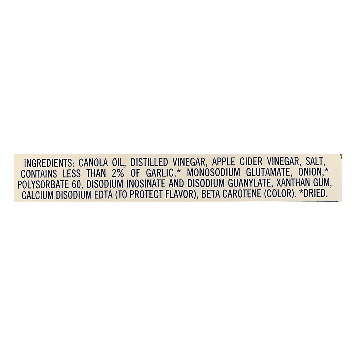 Canola Oil, Distilled Vinegar, Apple Cider Vinegar, Salt, Contains Less than 2% of Garlic (Dried), Monosodium Glutamate, Onion (Dried), Polysorbate 60, Disodium Inosinate and Disodium Guanylate, Xanth…