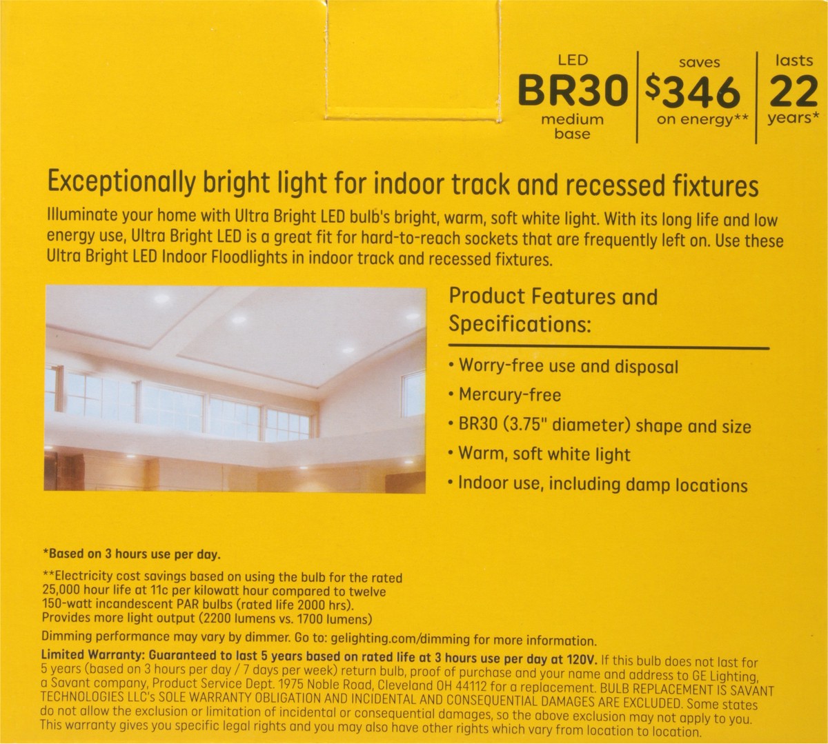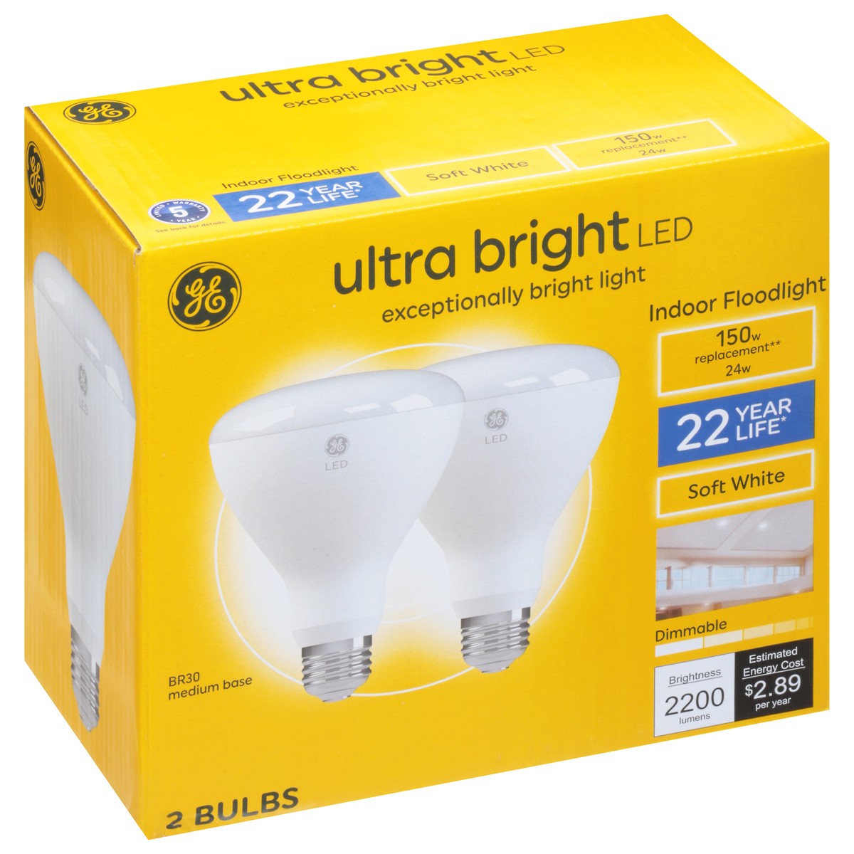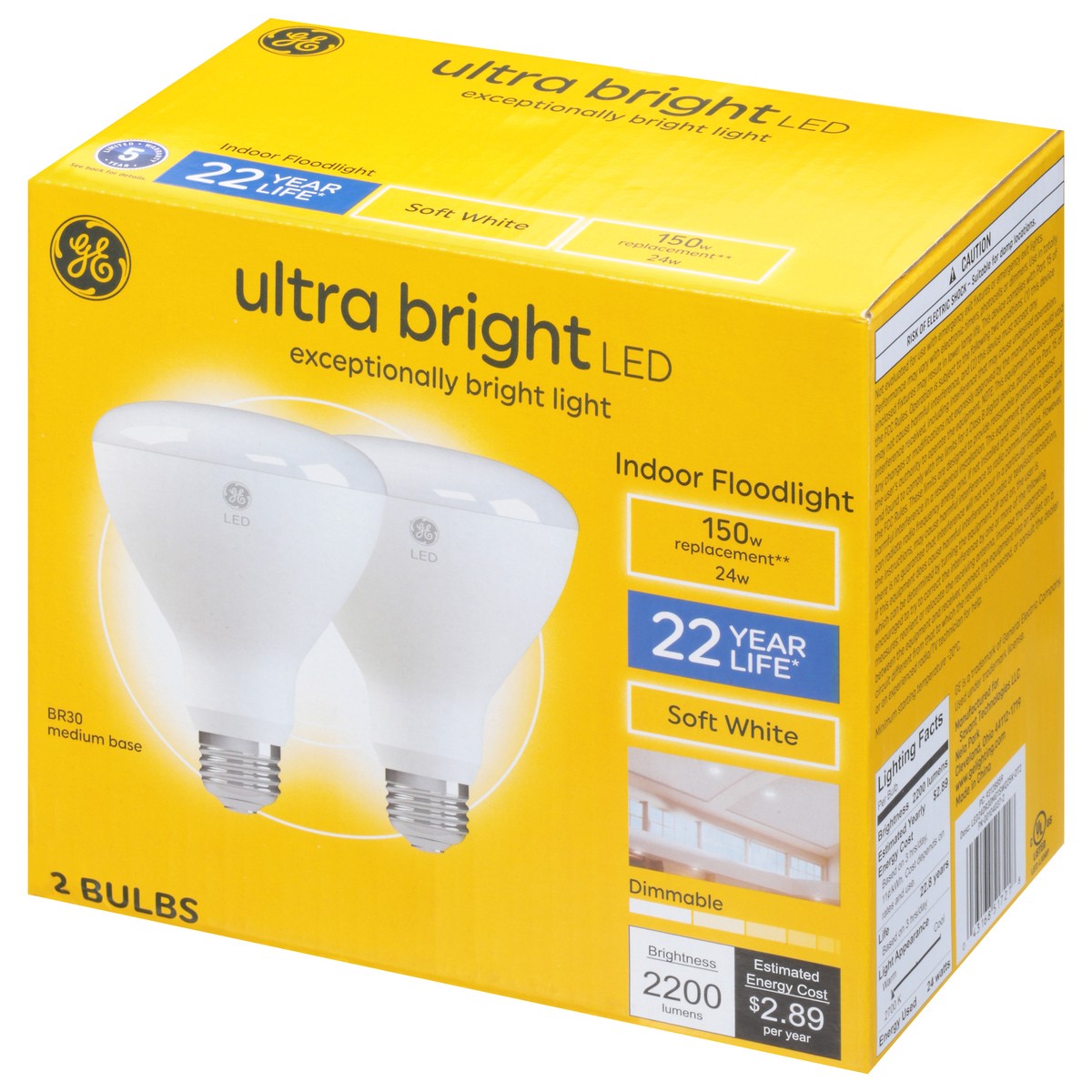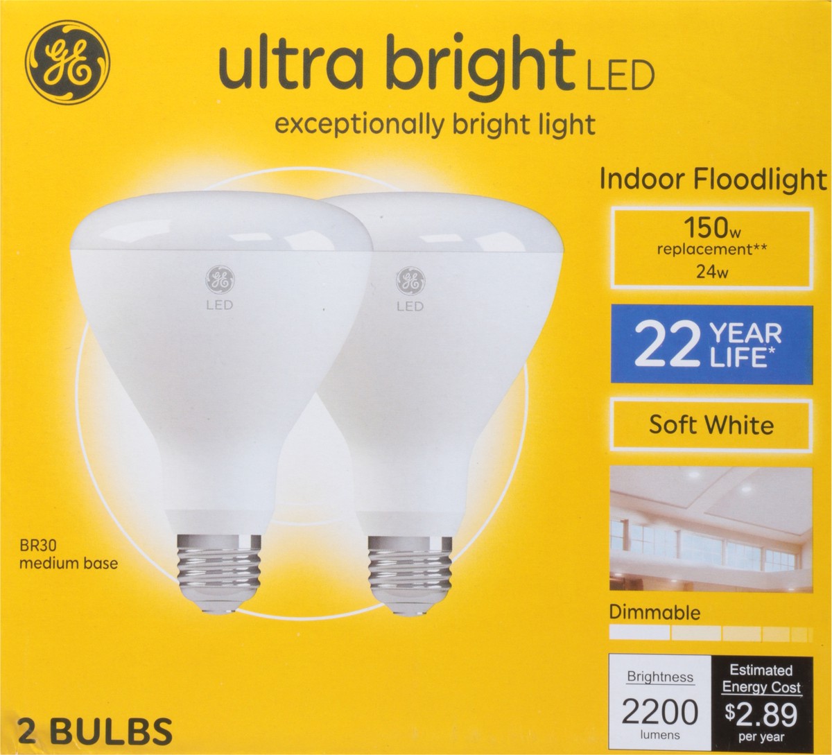 Brightness Quantity: 2200 lumens. Energy Info: $2.89 based on 3 hrs/day, 11 cents/kwh. Cost depends on rates and use. 24 watts. Package Info: 2. Bulb Info: Indoor. LED. Is Dimmable. Is Flood Light. Sc…