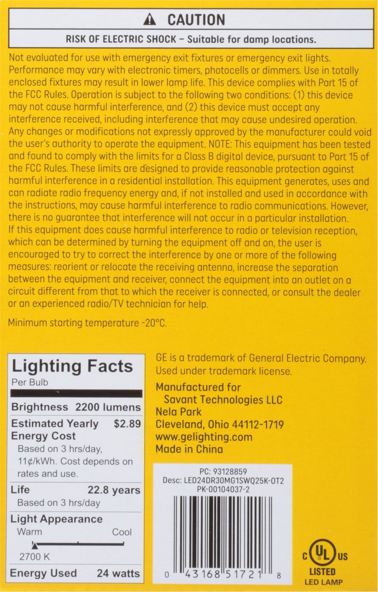 Brightness Quantity: 2200 lumens. Energy Info: $2.89 based on 3 hrs/day, 11 cents/kwh. Cost depends on rates and use. 24 watts. Package Info: 2. Bulb Info: Indoor. LED. Is Dimmable. Is Flood Light. Sc…
